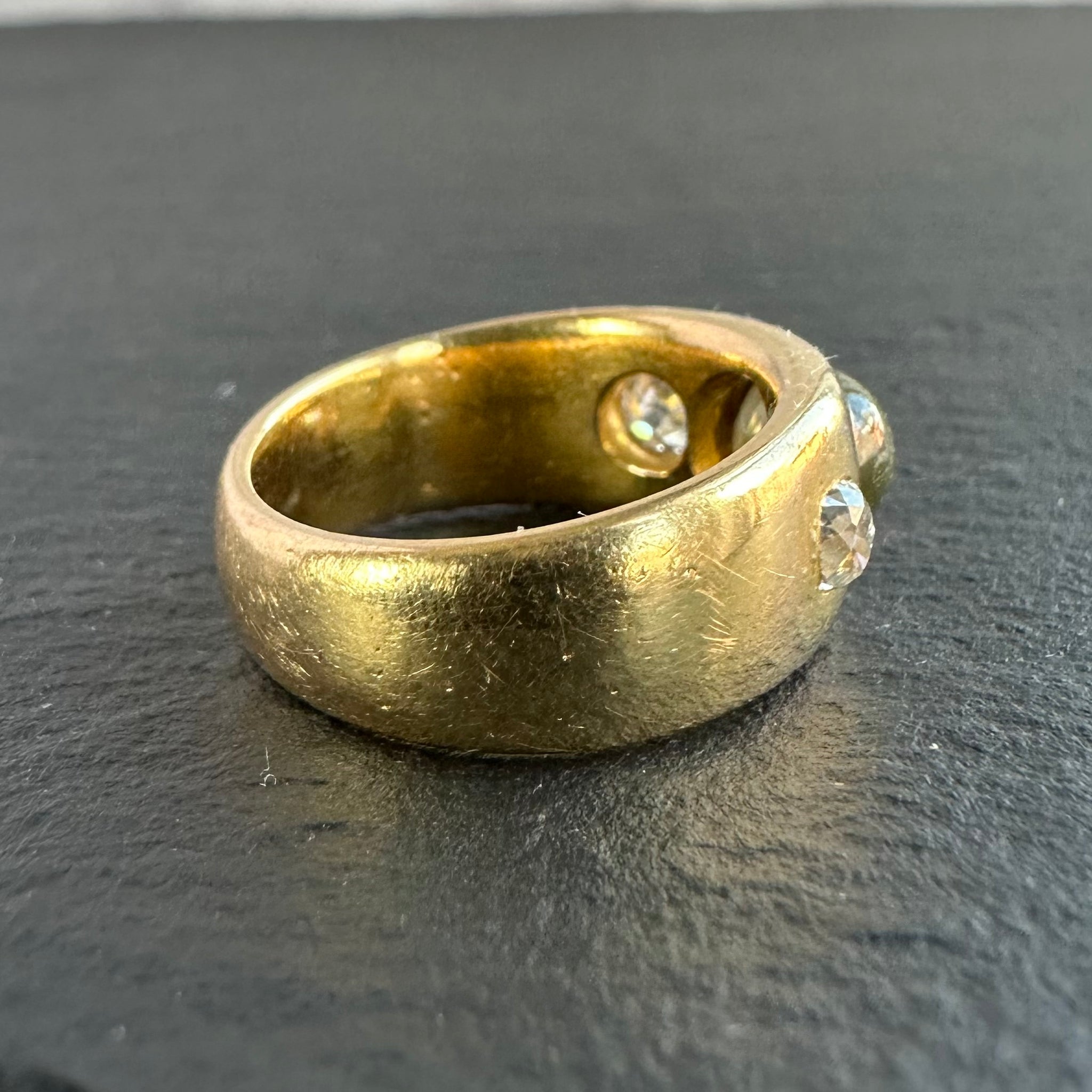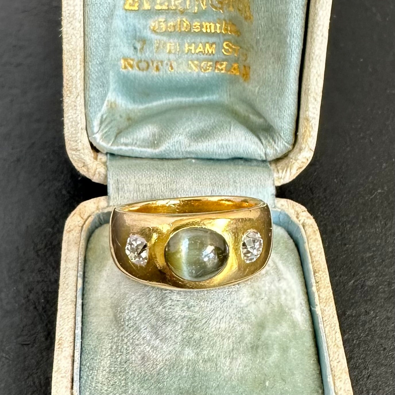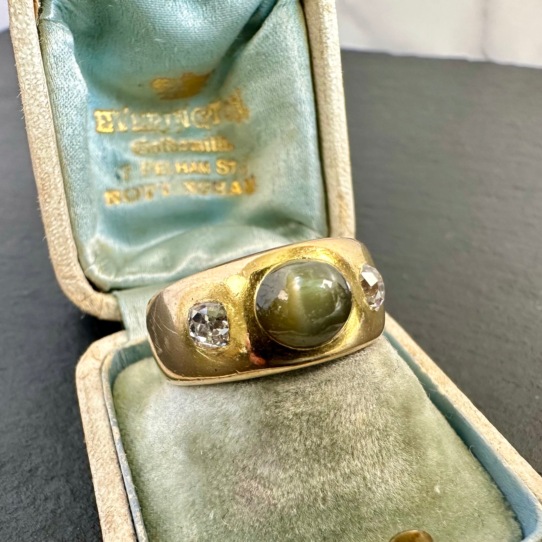 Antique, 18k gold three stone ring featuring central, 2.75ct oval cats eye Chrysoberyl cabochon with crisp, straight “eye” flanked by 2 old mine cut squoval cushion cut diamonds totaling 0.43ct, I/VVS.