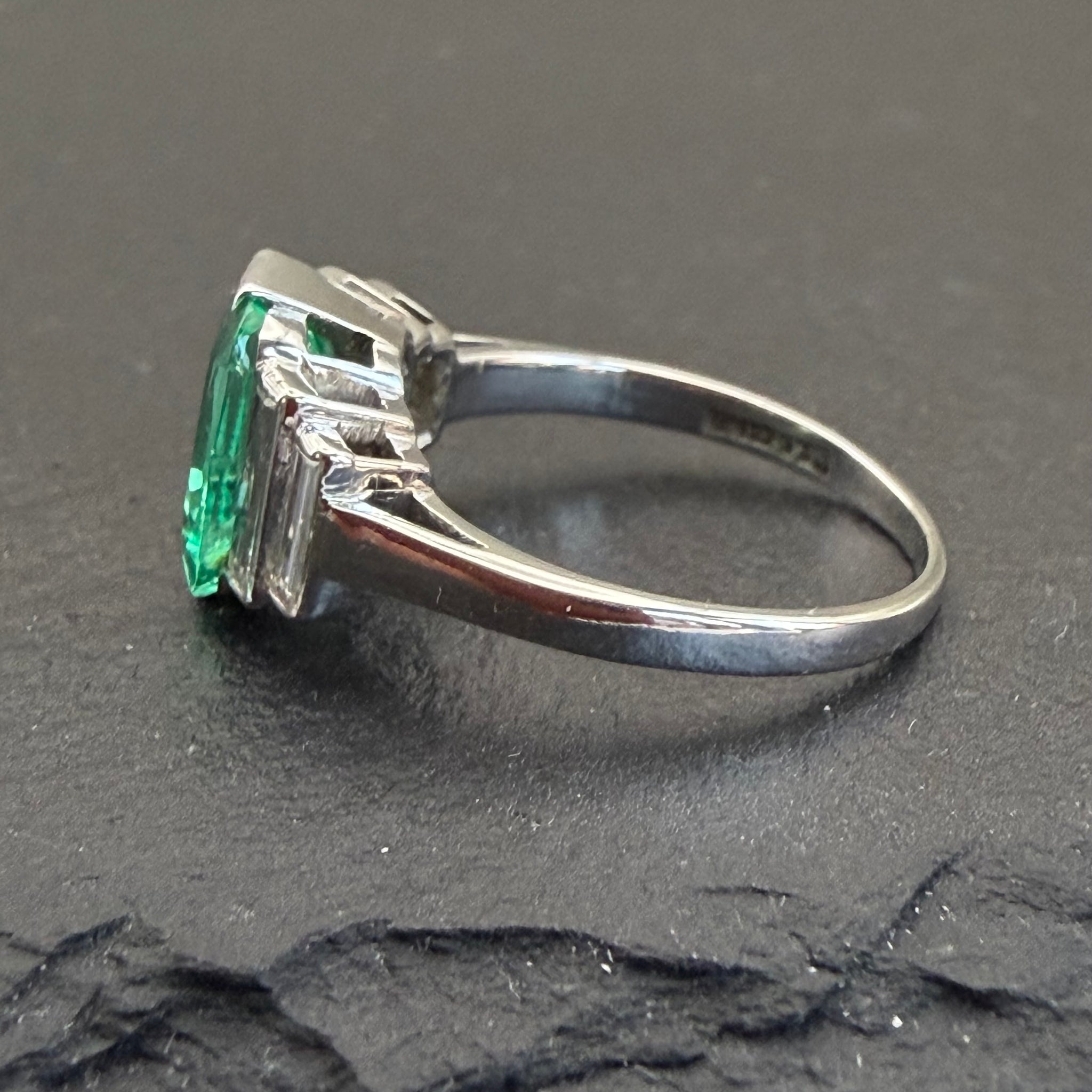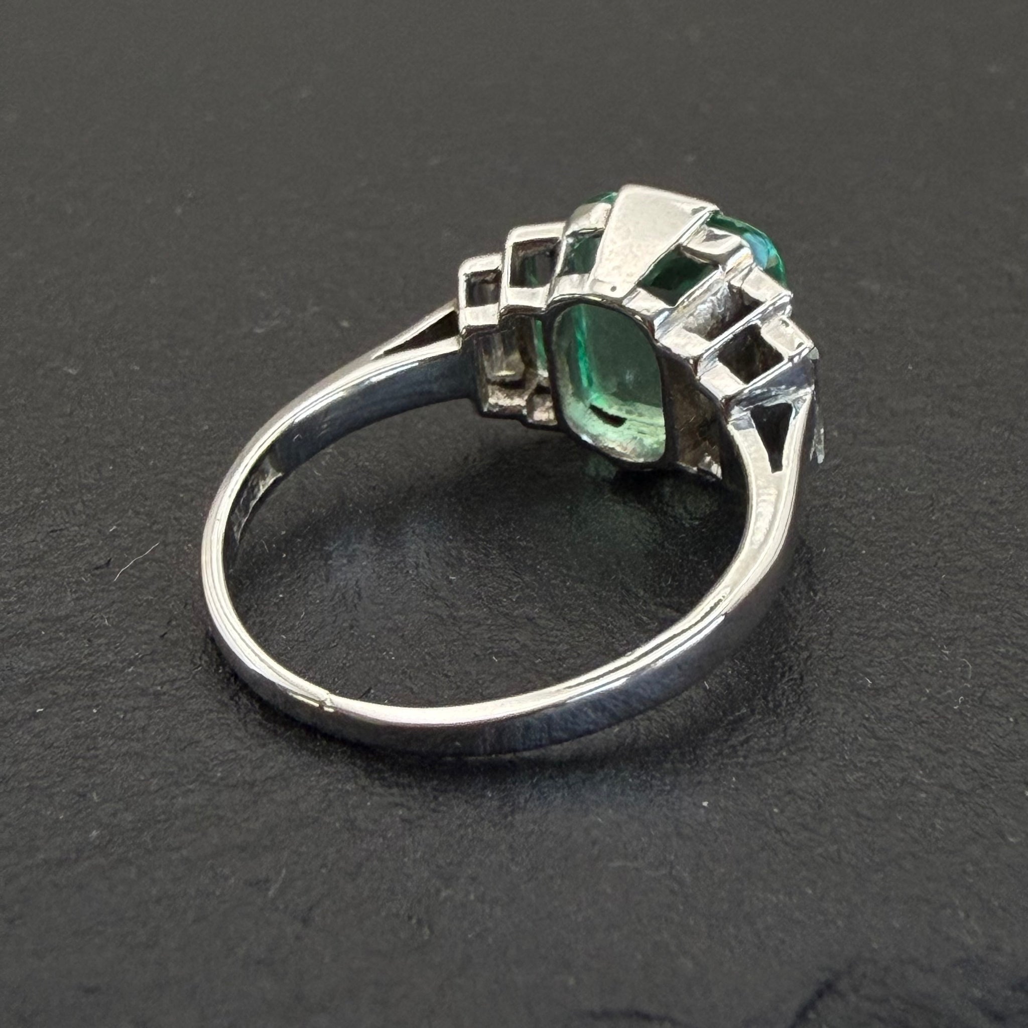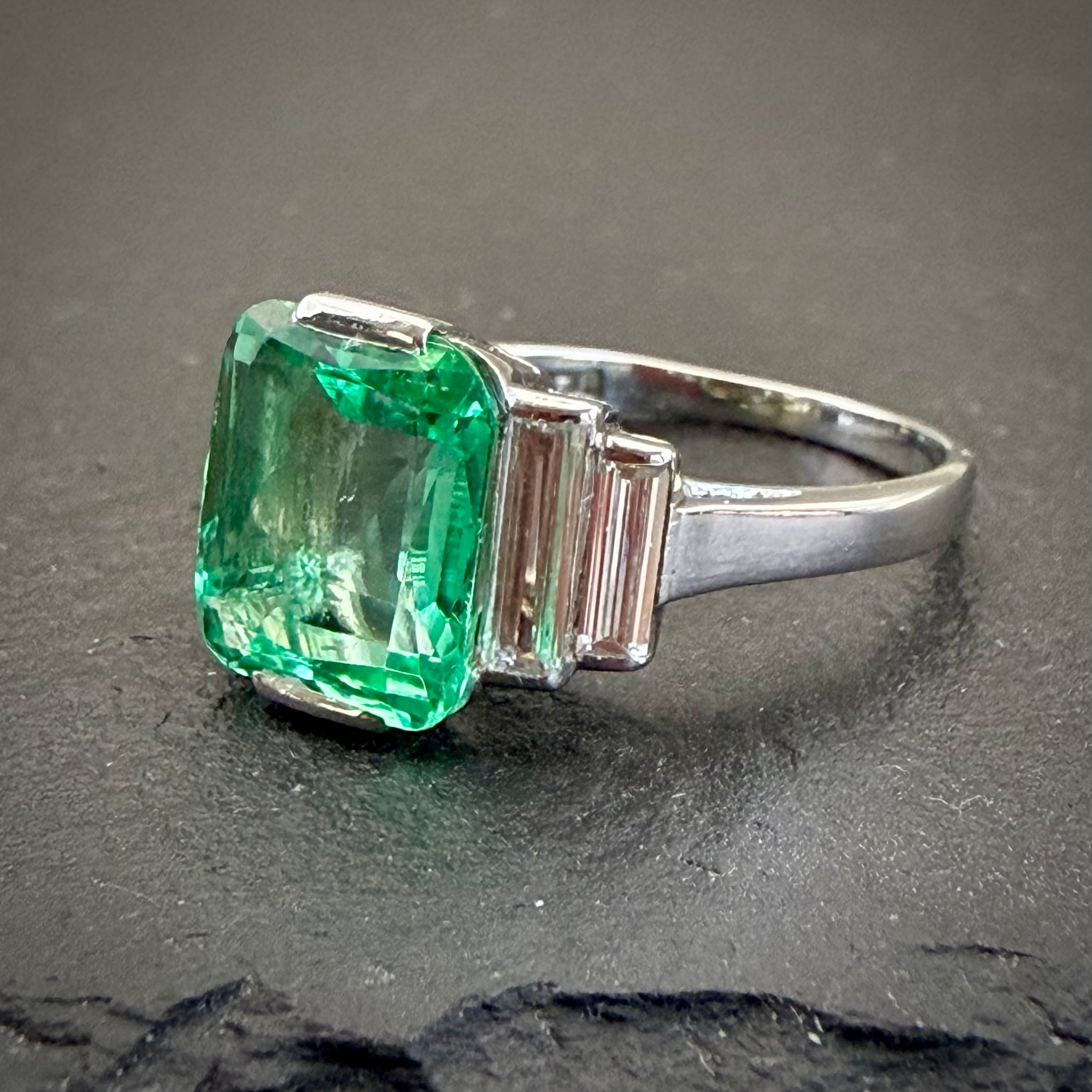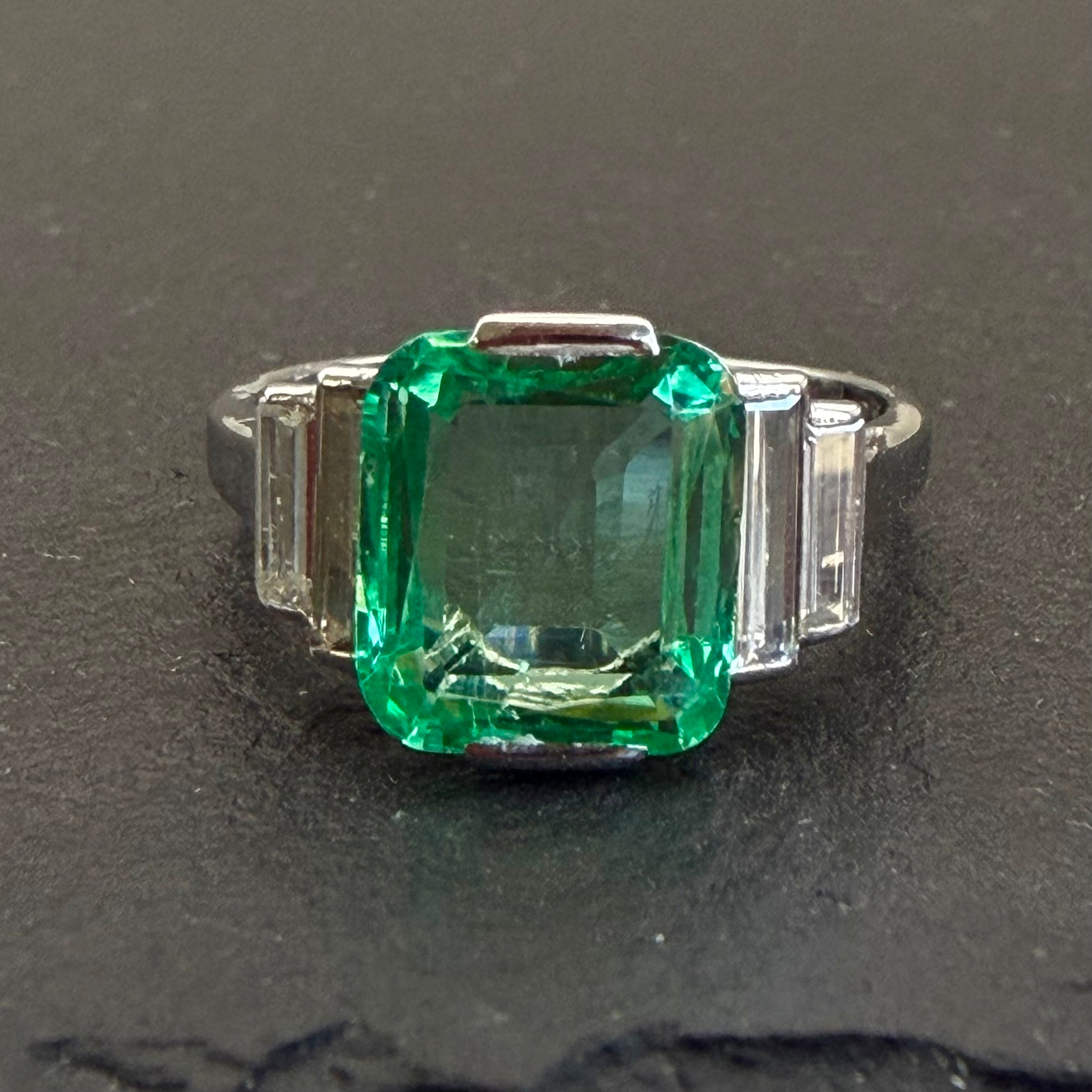 Antique, Art Deco era Colombian emerald and diamond ring featuring a central, 1.1ct, exceptionally spready emerald flanked by four, baguette diamonds totaling 0.6ct in a step down design, set in 18k white gold.
