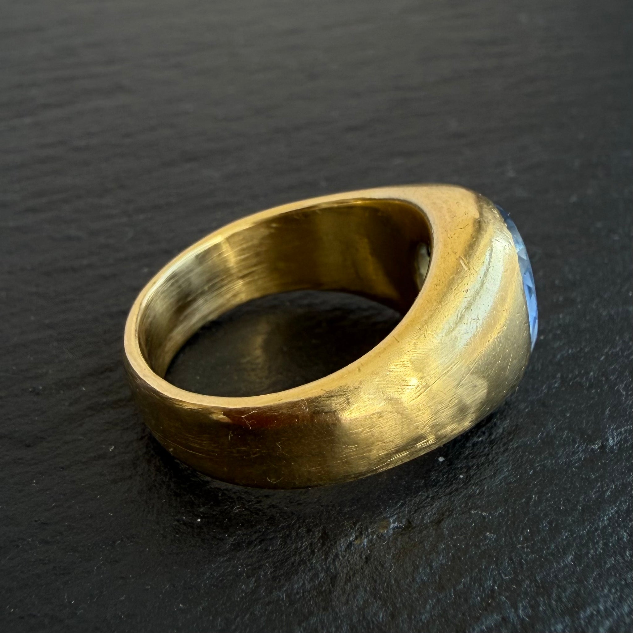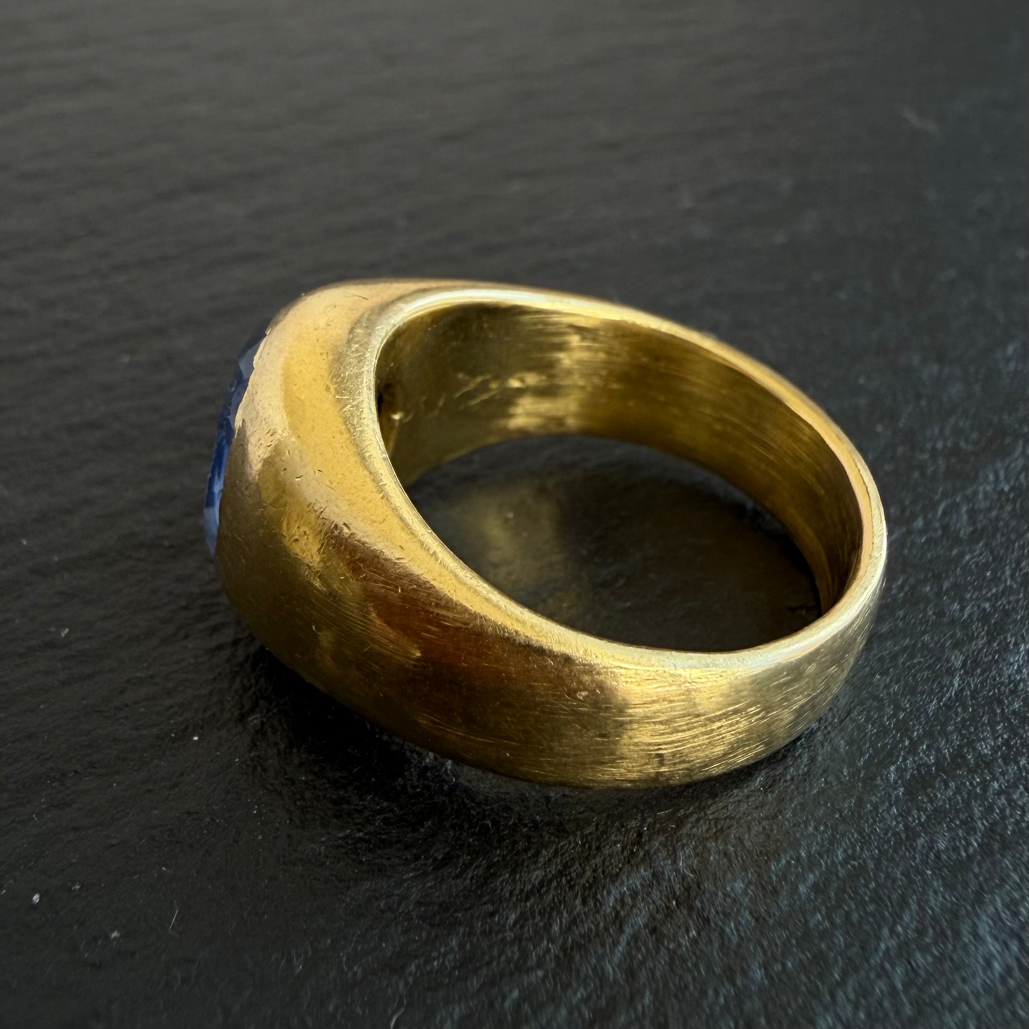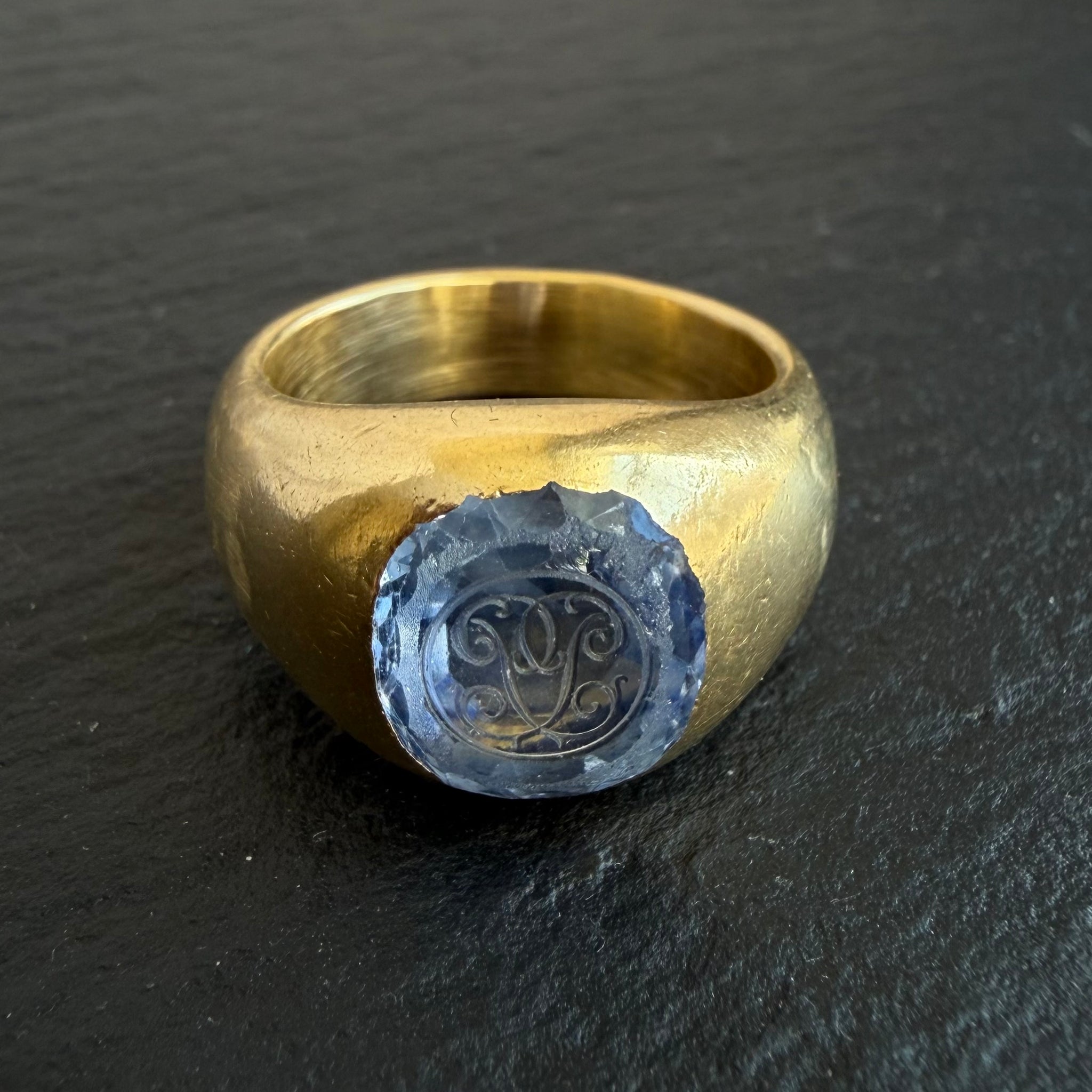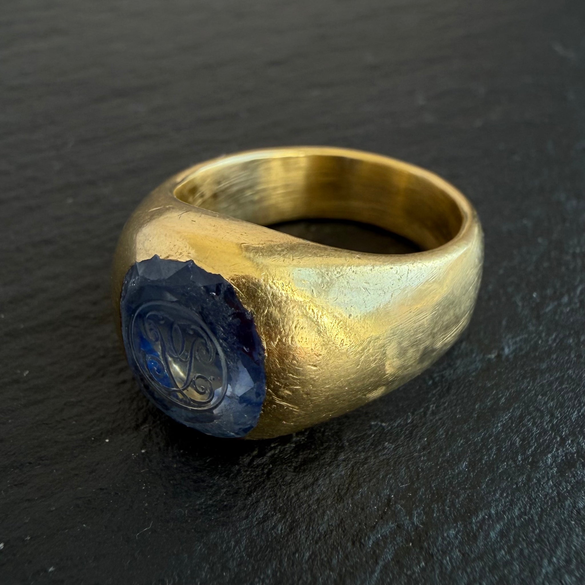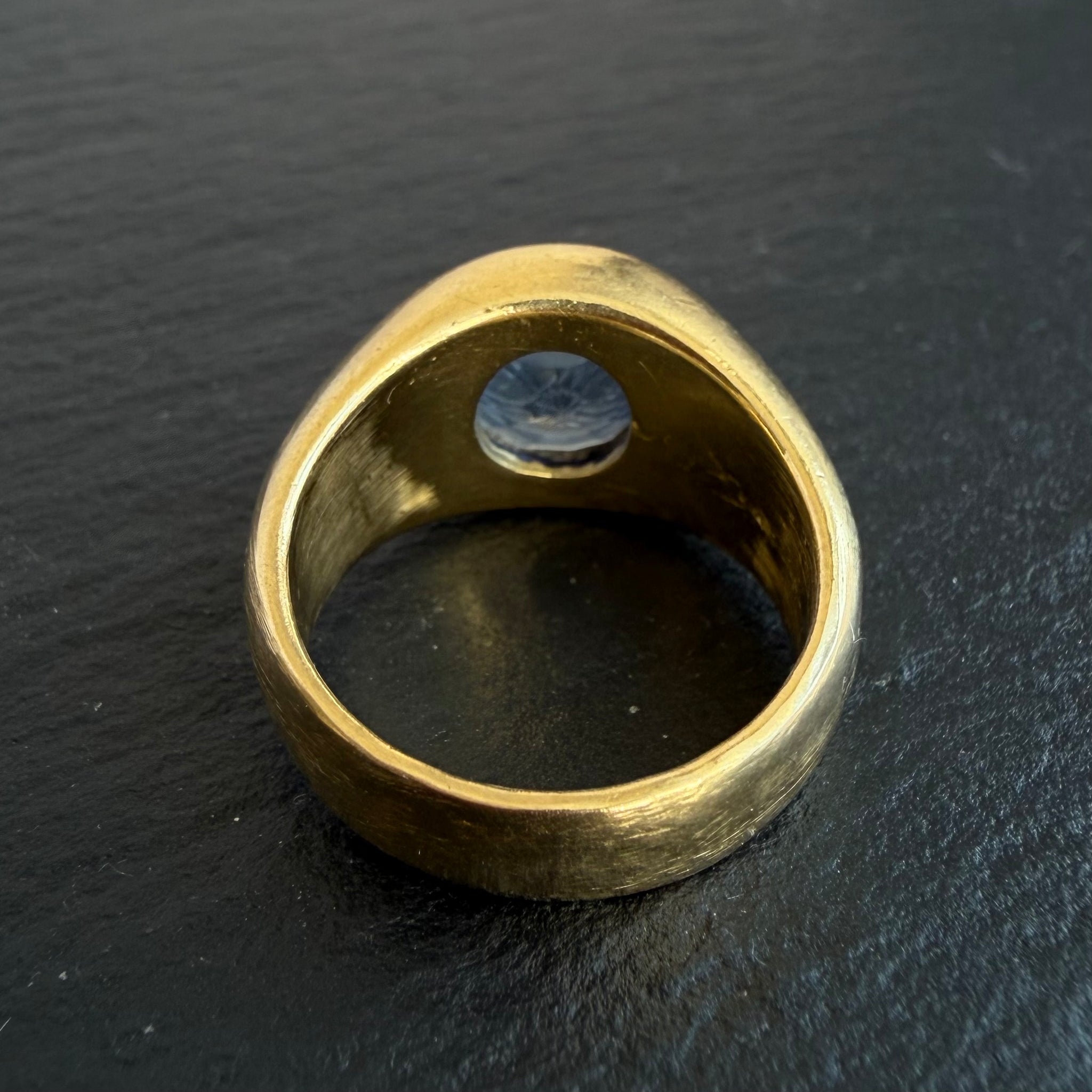 Antique 18kt yellow gold, gypsy set, “PP” engraved 4.4ct Ceylon sapphire intaglio ring.