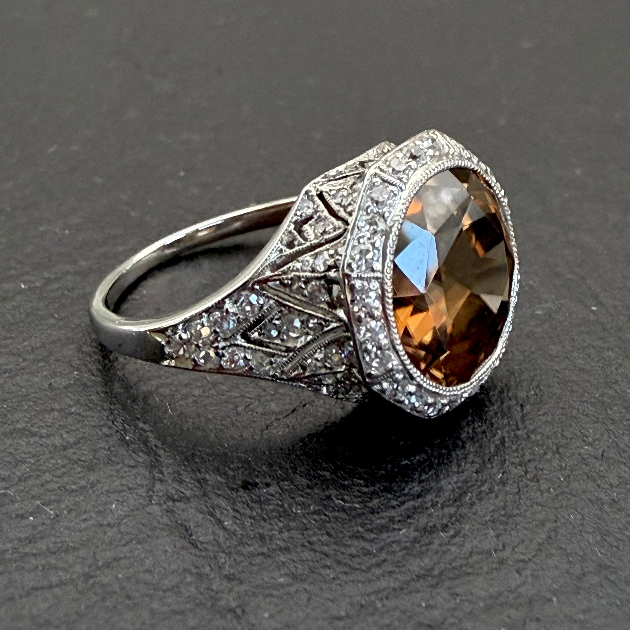 Art deco era, zircon and diamond ring set in platinum. Featuring a central 6.46ct natural zircon surrounded by a beautifully detailed setting set with approximately 0.5ct in diamonds.