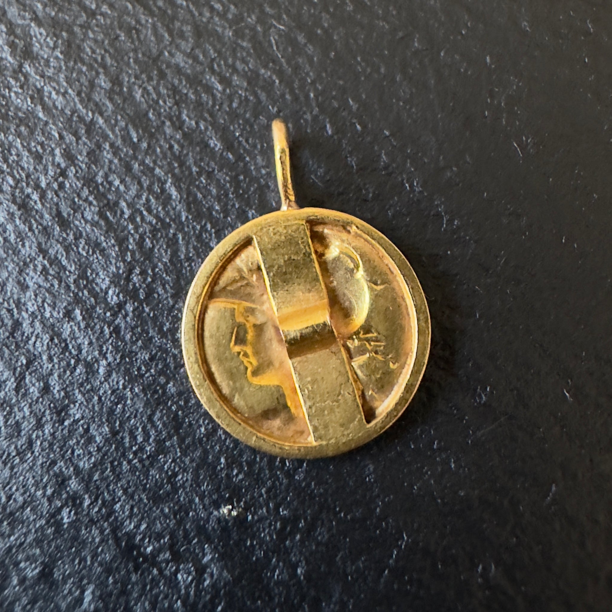 Antique, 18k gold charm featuring a person in profile in a hat or helmet with a mouse and bird.