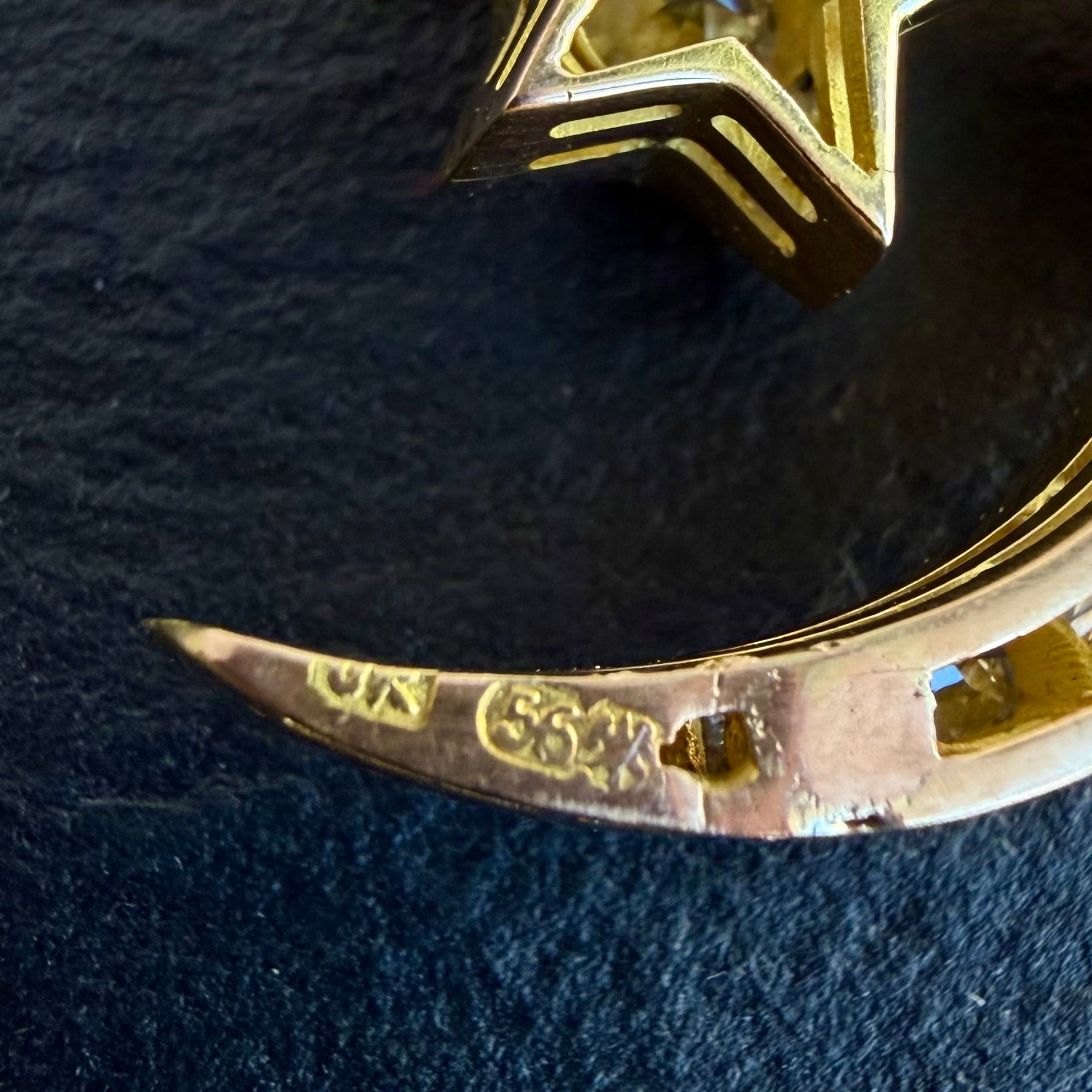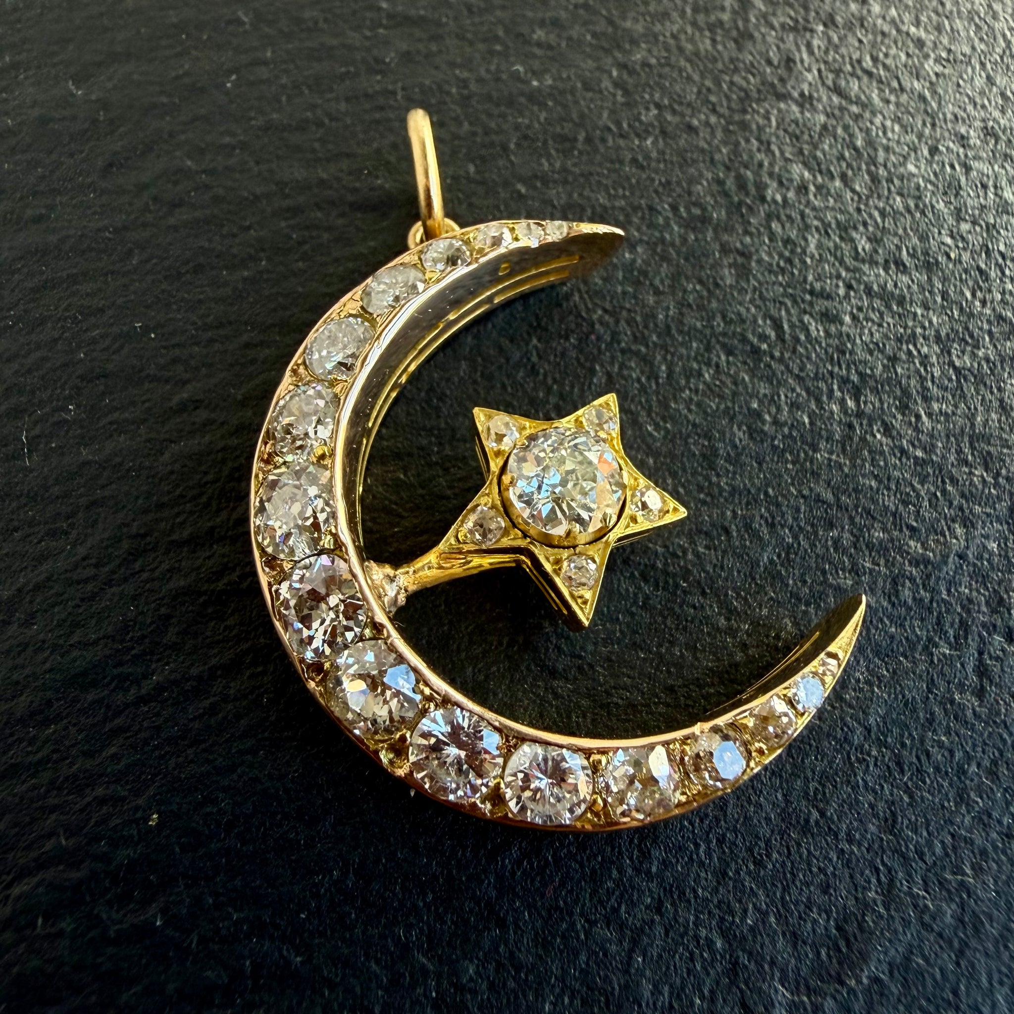 Antique, 2.4ct crescent moon pendant with central diamond star set in 14k gold.