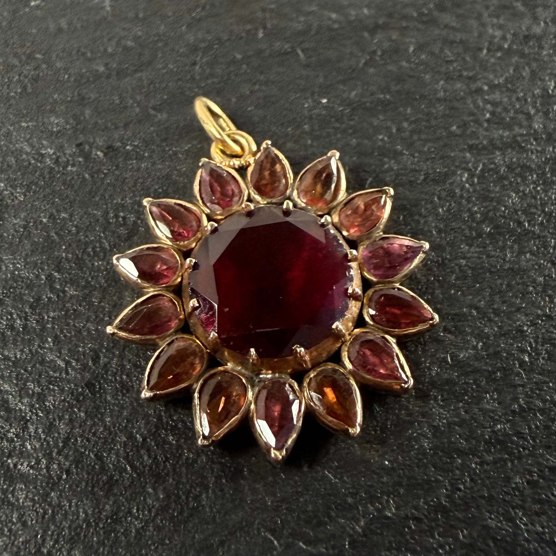 Georgian era, closed/foil backed garnet flower pendant set in 9k gold.