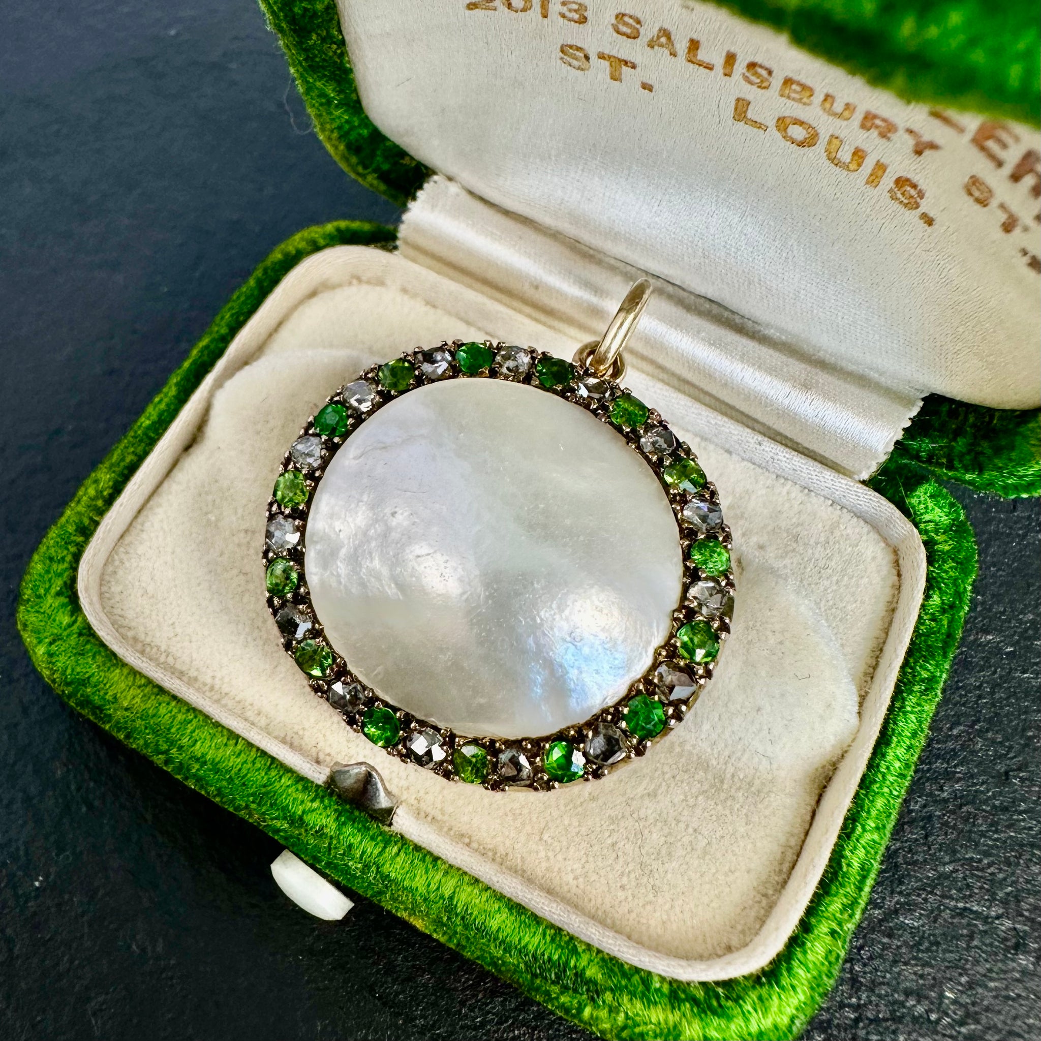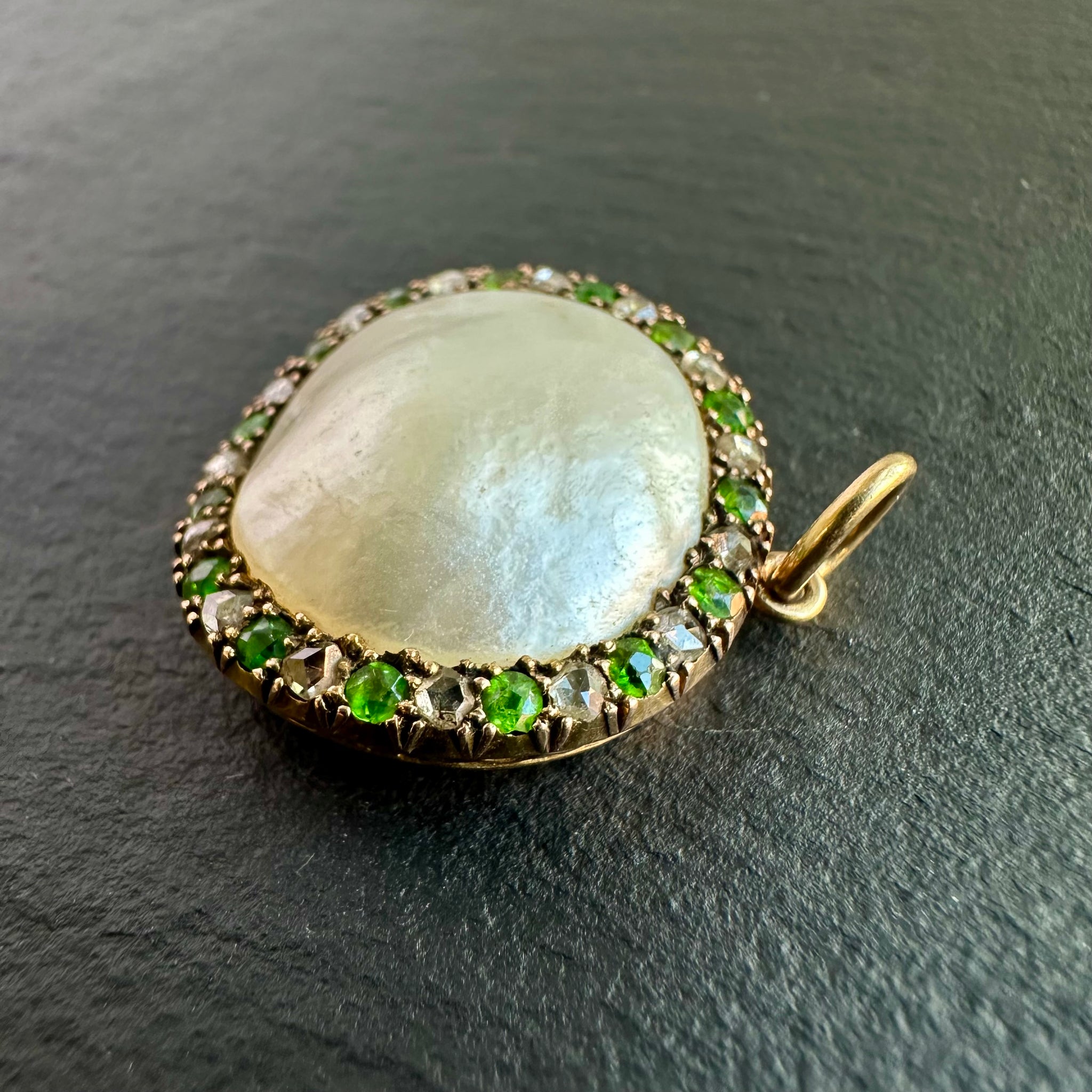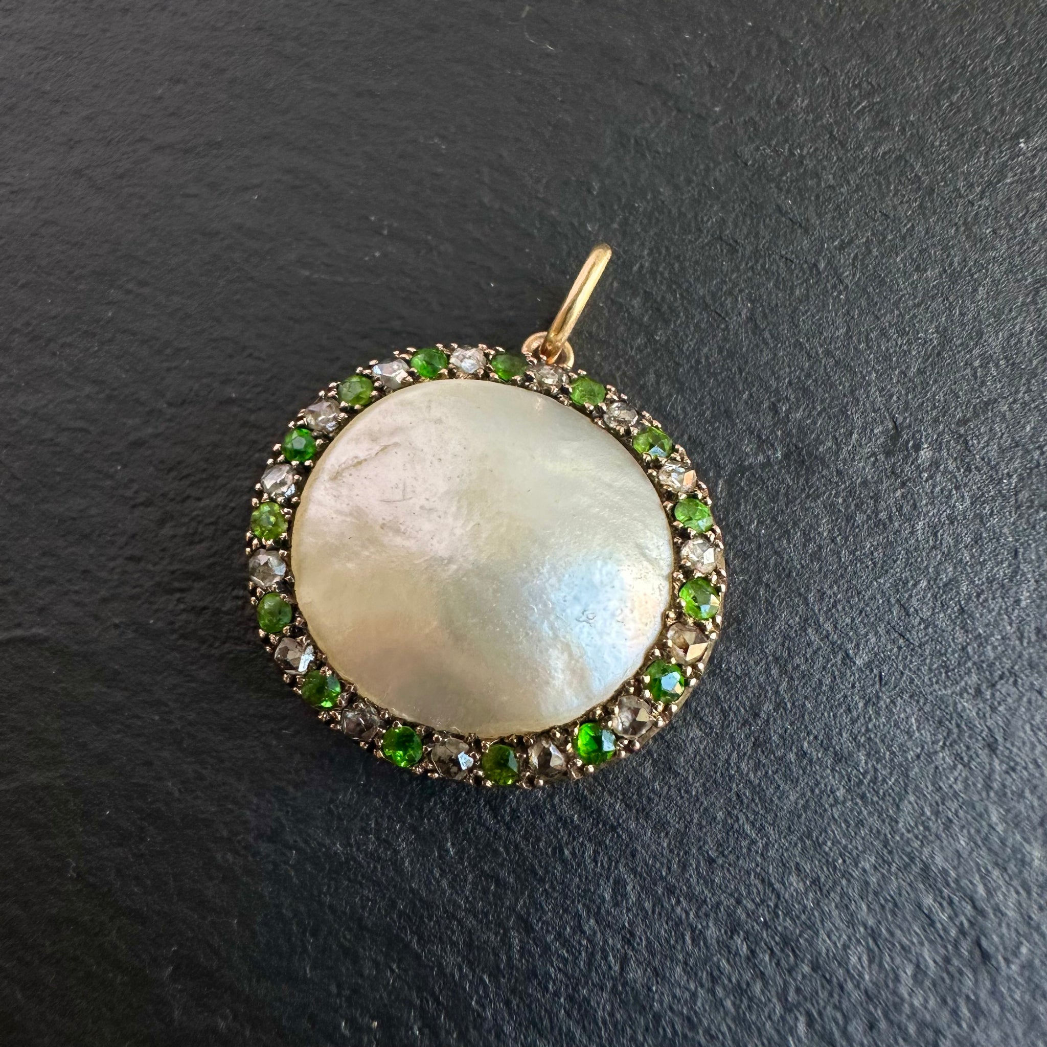 Victorian era, custom fitted 14kt yellow gold pendant with a mother of pearl center surrounded by alternating demantoid garnets and rose diamonds.