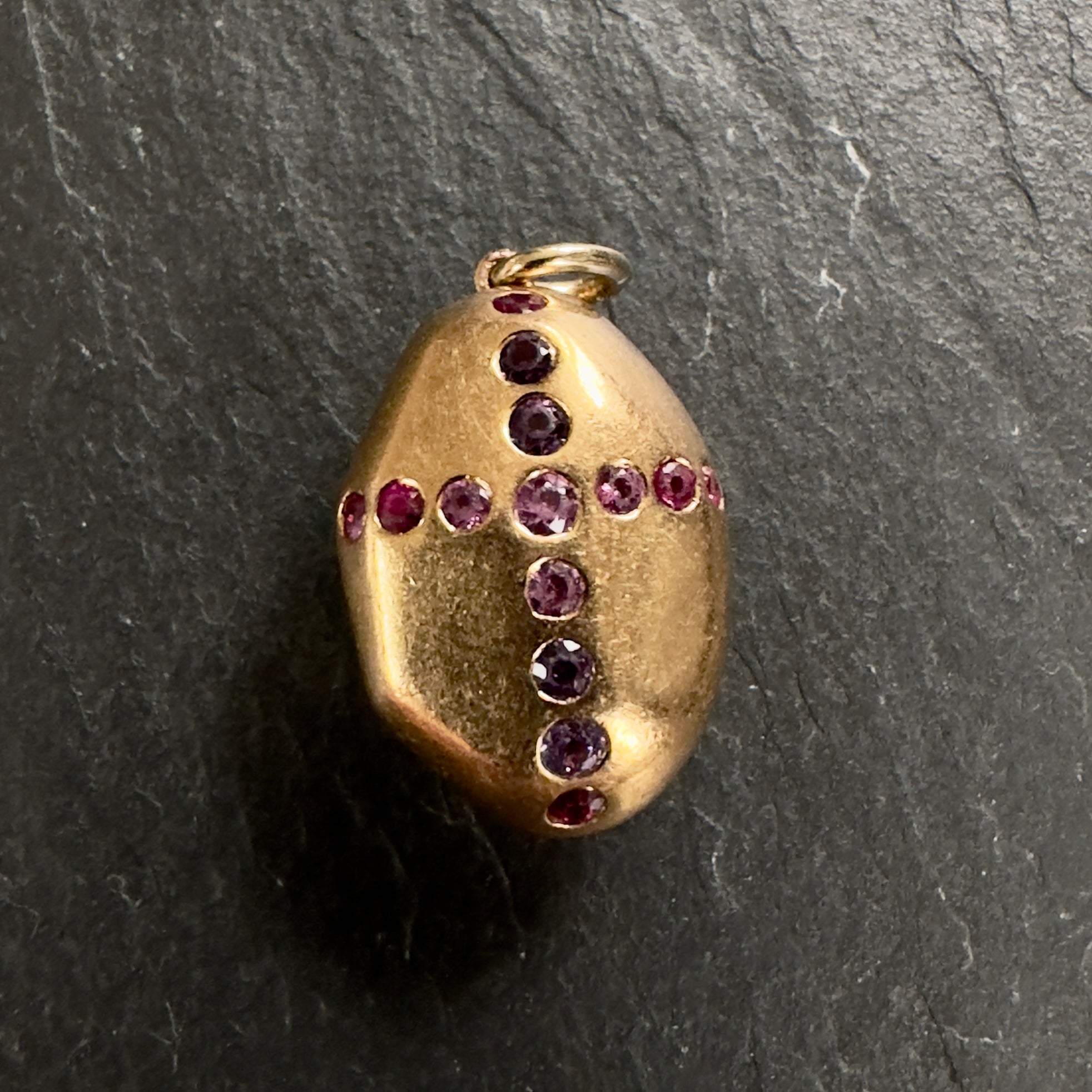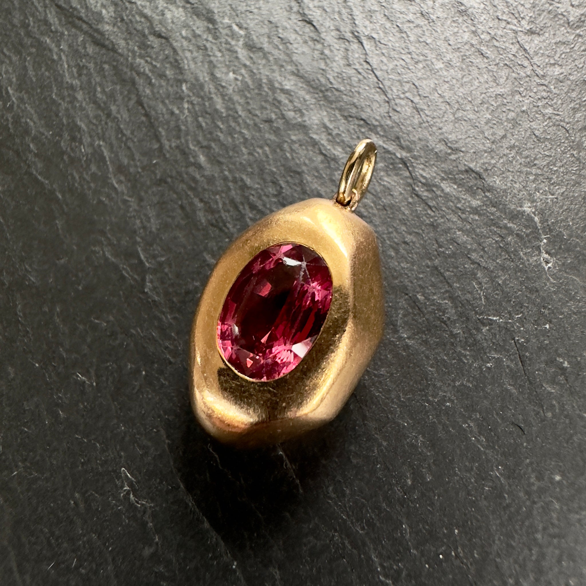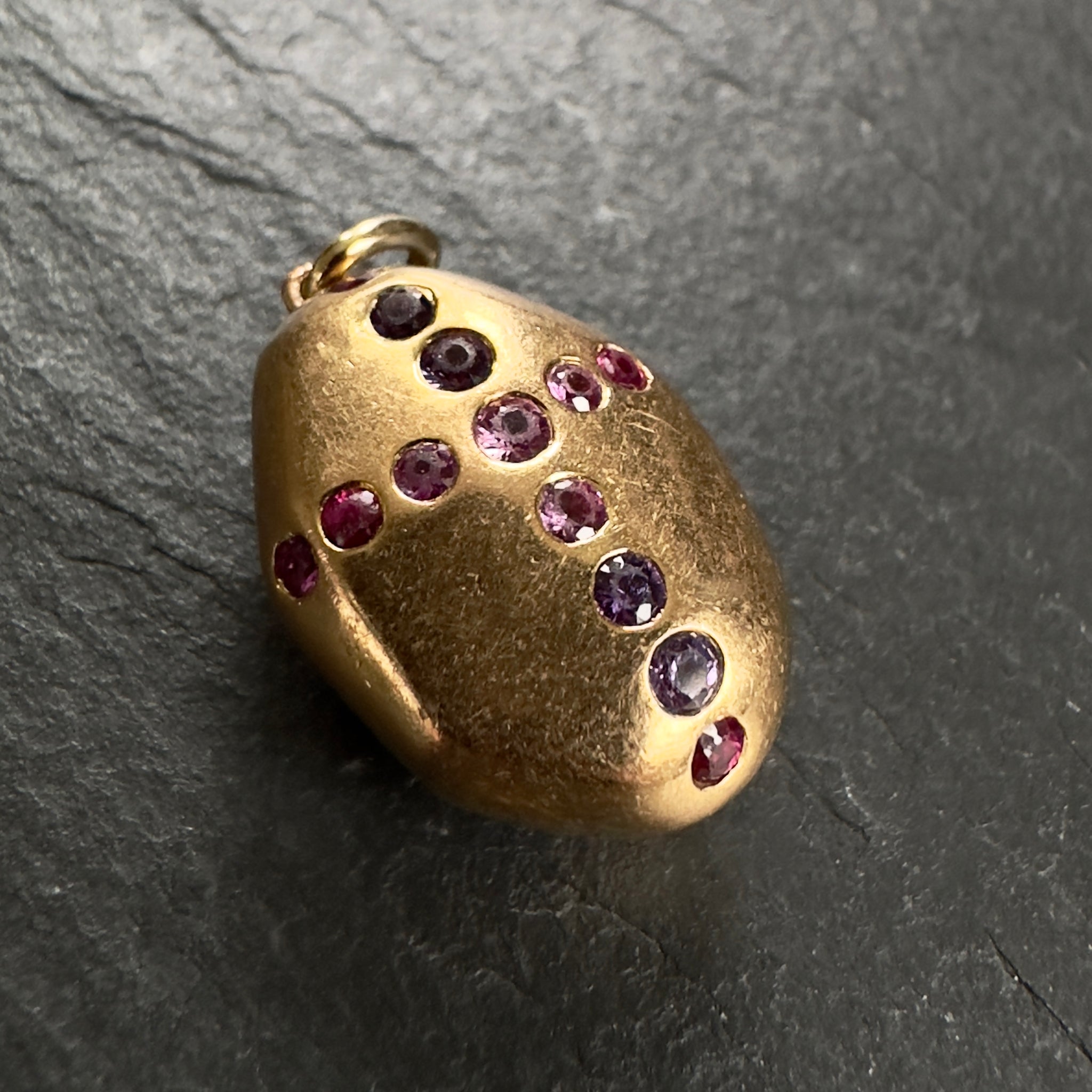 Modern, circa 2015 ‘Prince Dimitri’ designed 20k gold pendant featuring a natural unheated 2.67ct reddish pink sapphire with 14 round pink and purple sapphires on the back side in the shape of a cross.