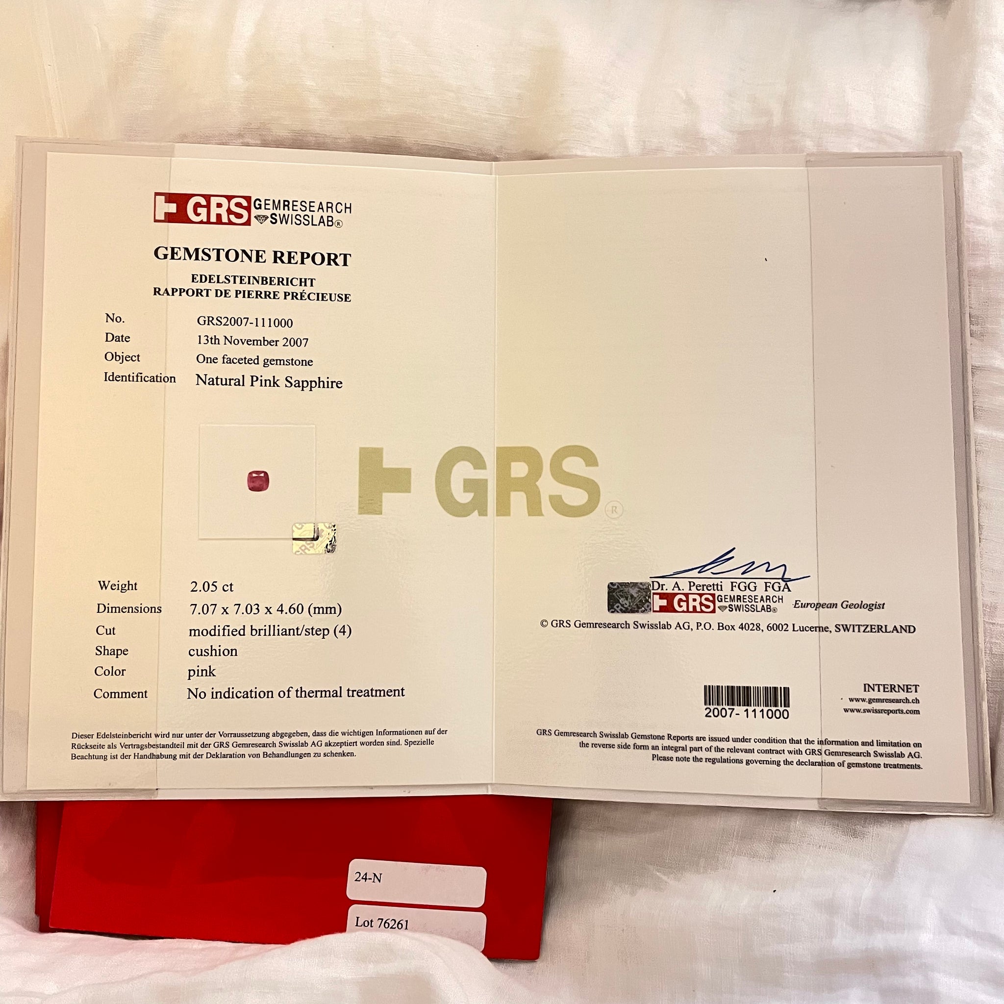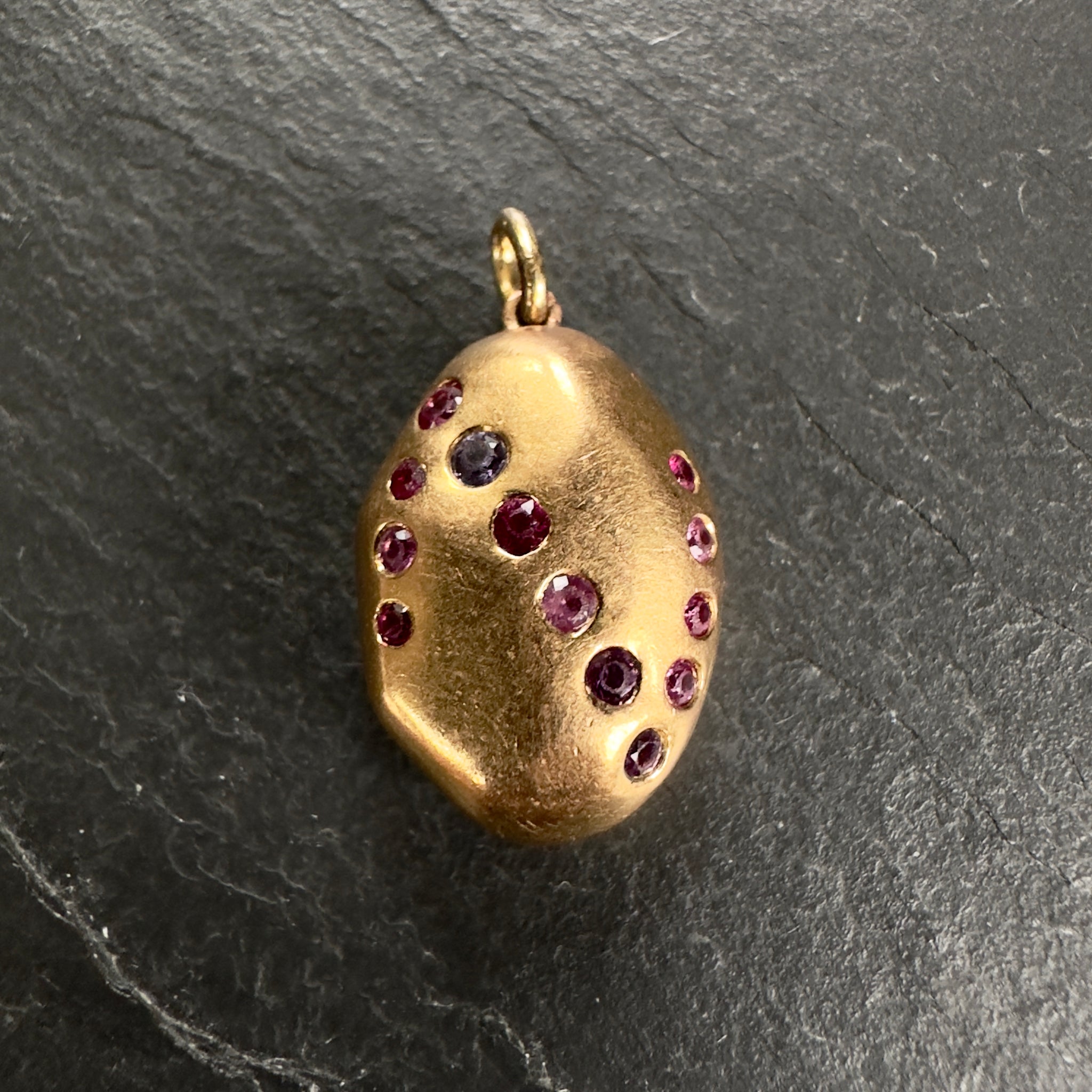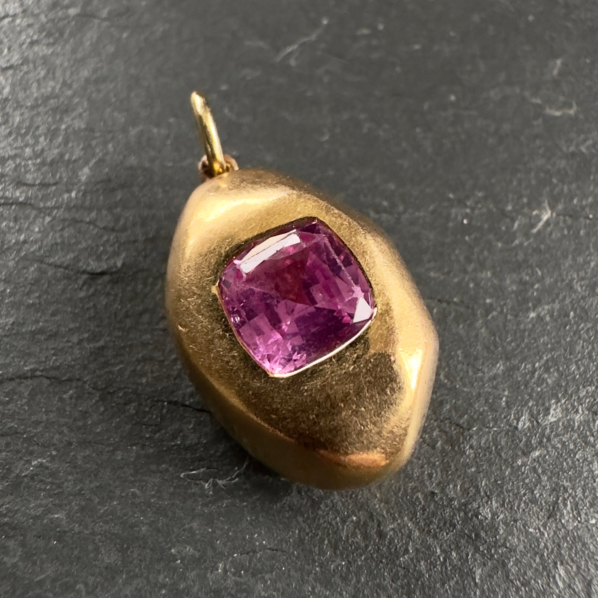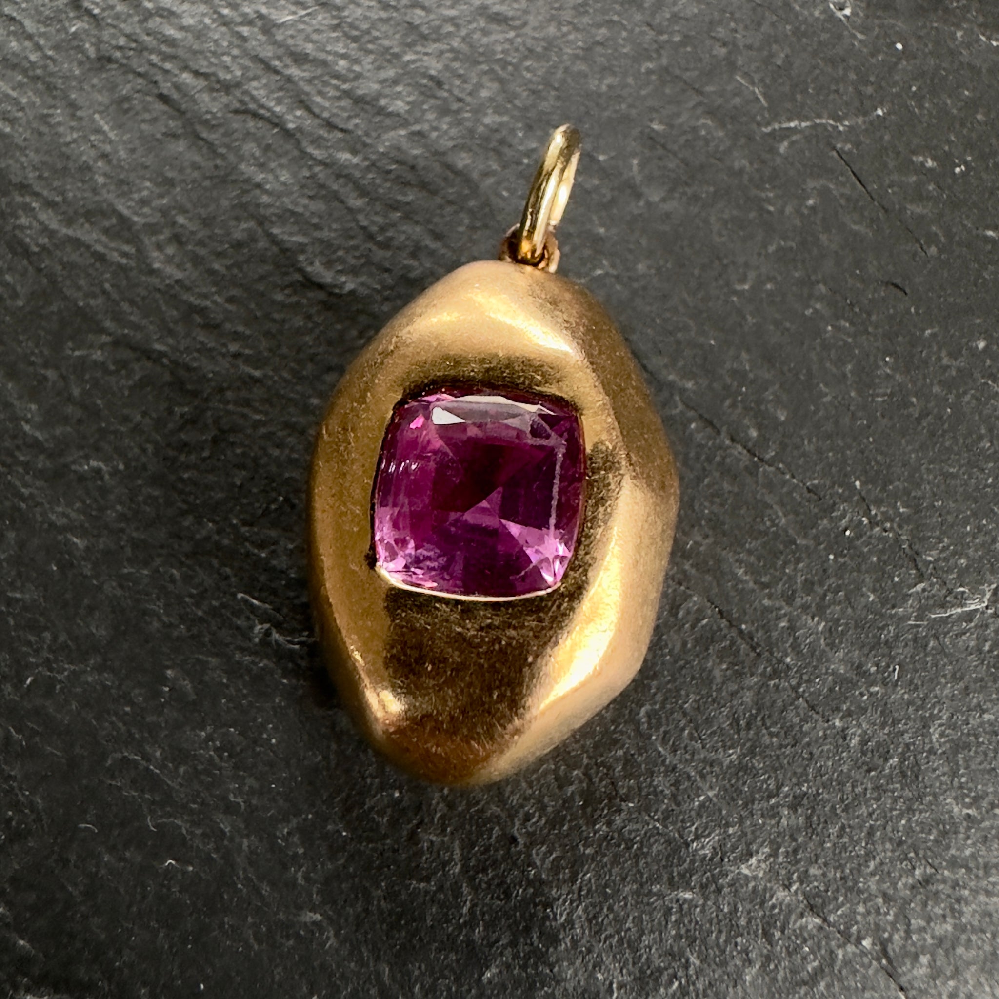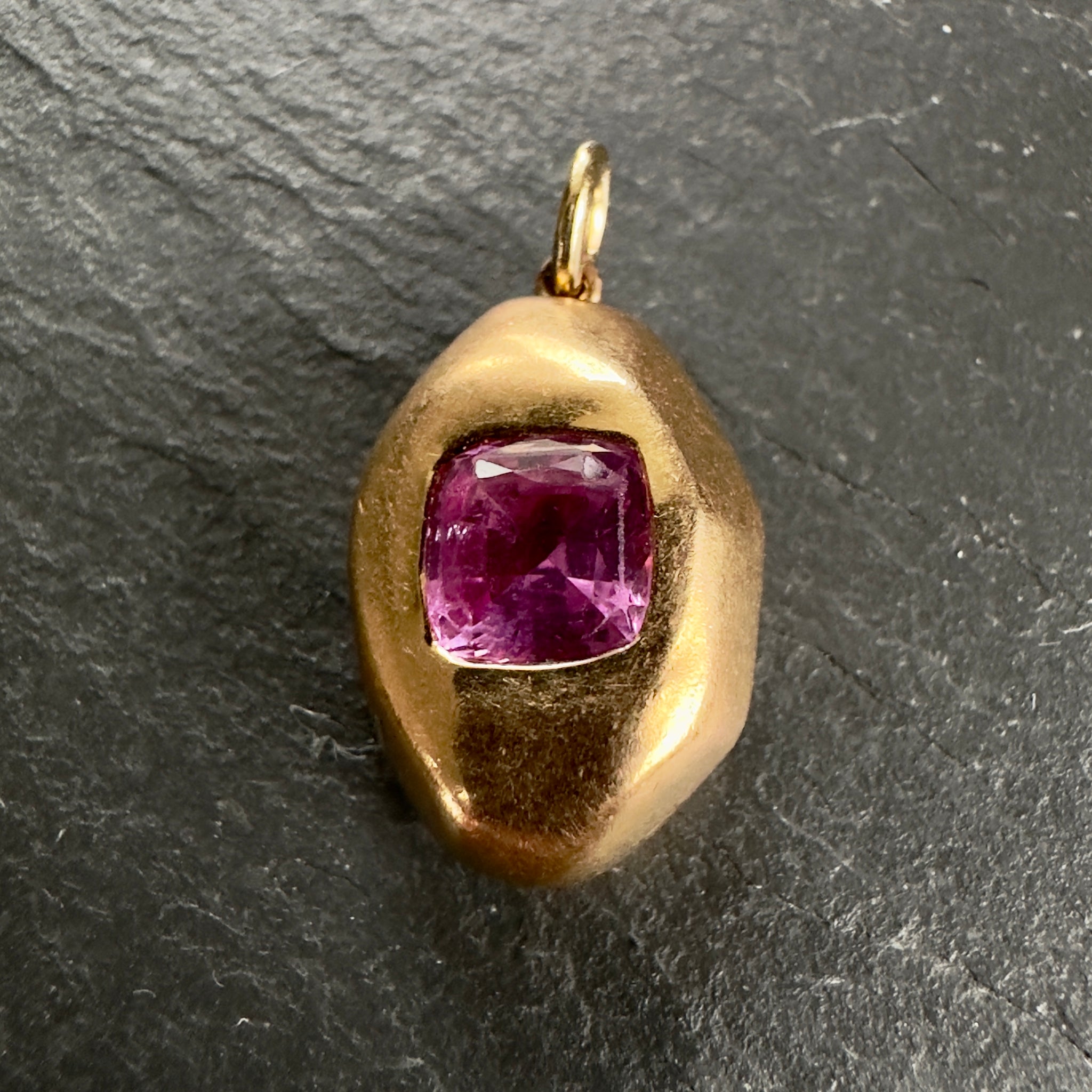Modern, circa 2015 ‘Prince Dimitri’ designed 20k gold pendant featuring a certified natural 2.05ct unheated pink sapphire with 13 round pink and purple sapphires in a sideways Z shape on the back side.