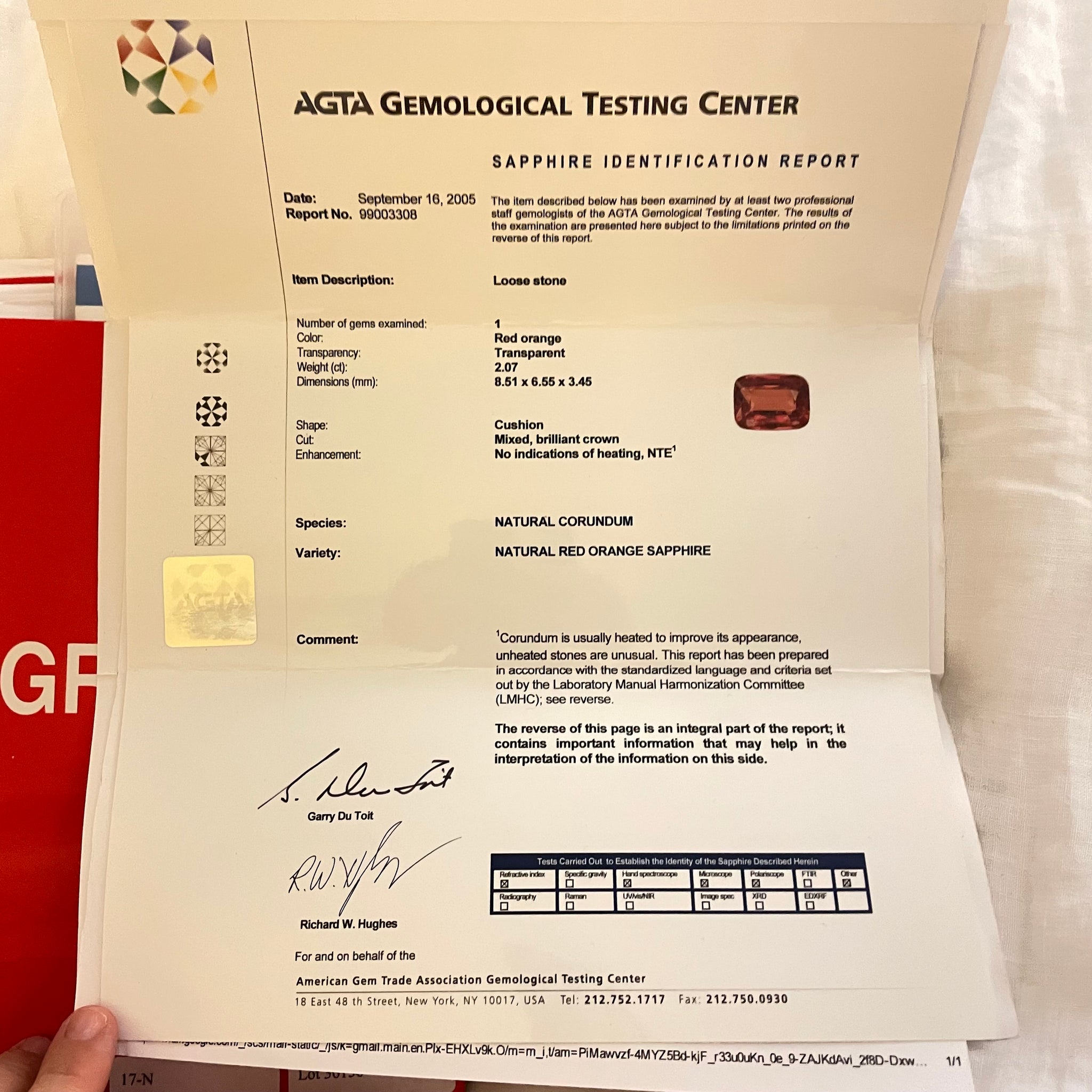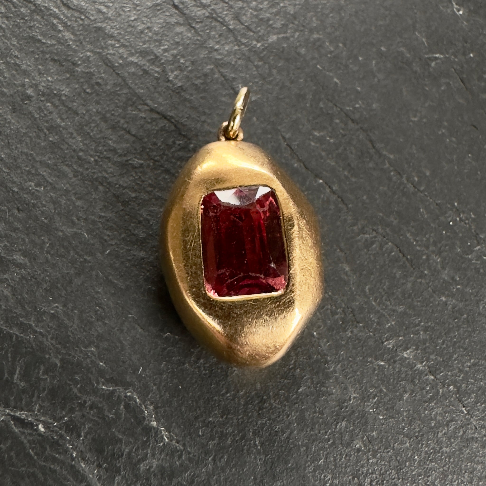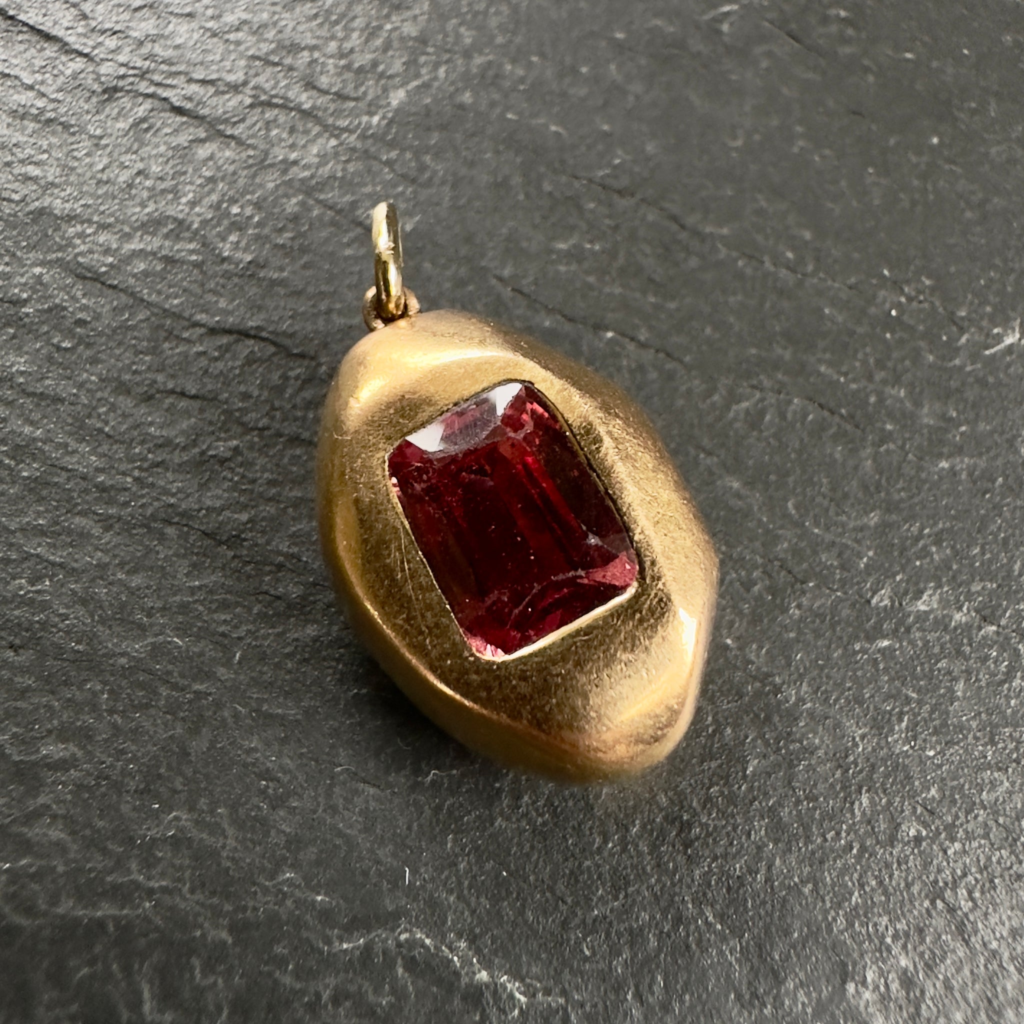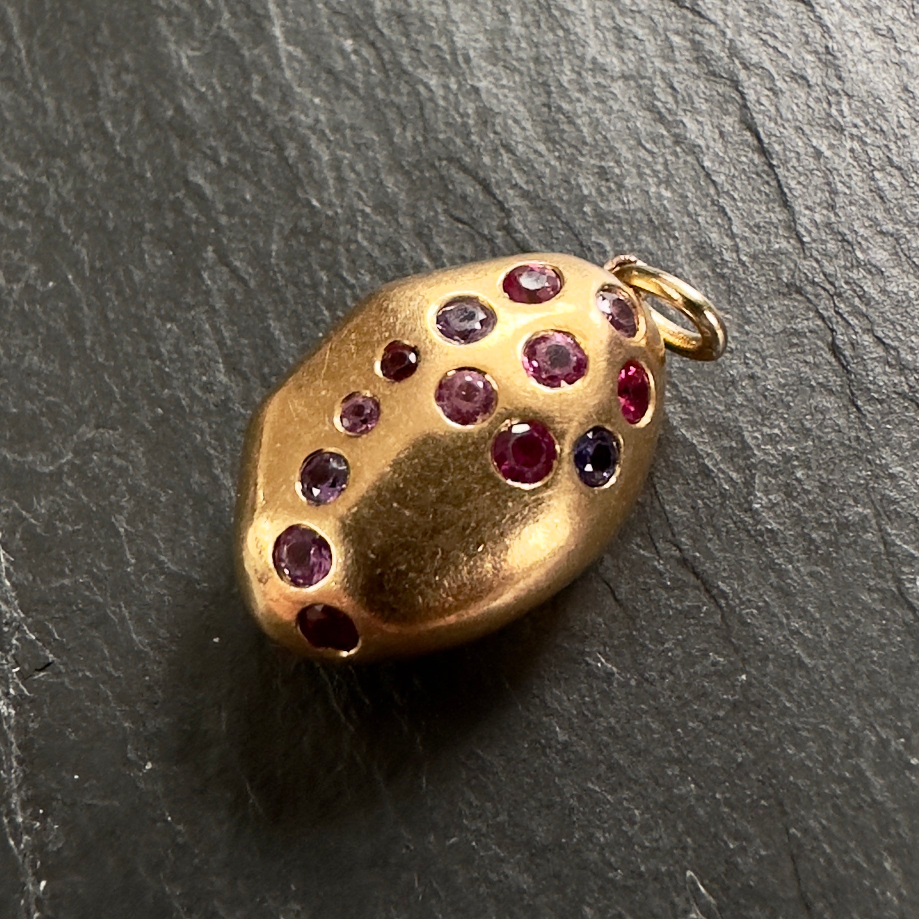 Modern, circa 2015 ‘Prince Dimitri’ designed 20k gold pendant featuring a certified natural unheated 2.07ct red-orange sapphire with 13 round pink and purple sapphires in a paisley shape on the back side.