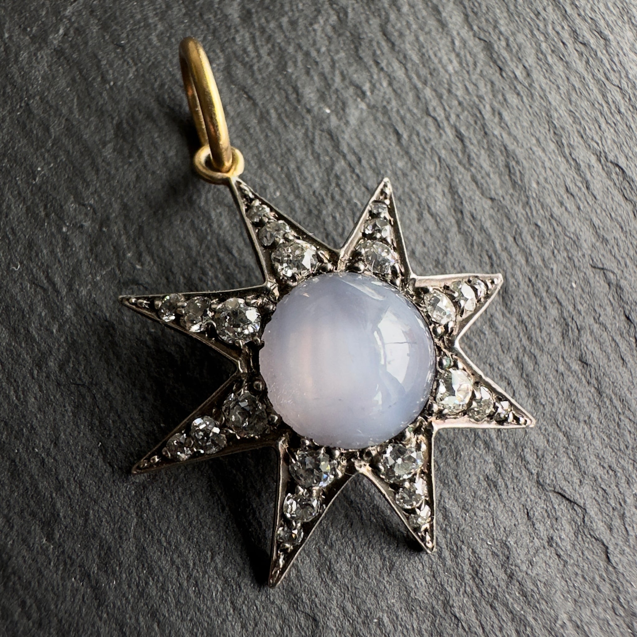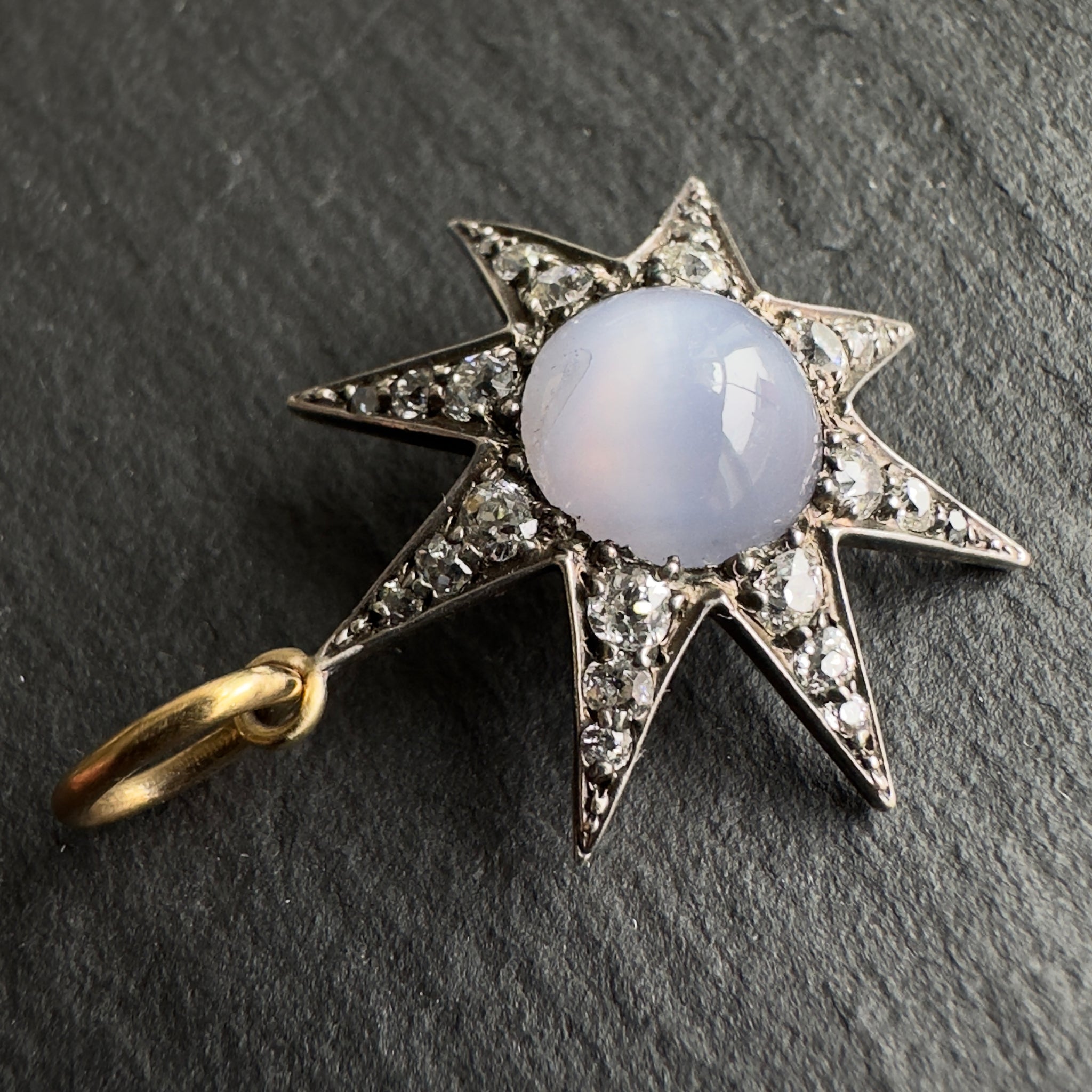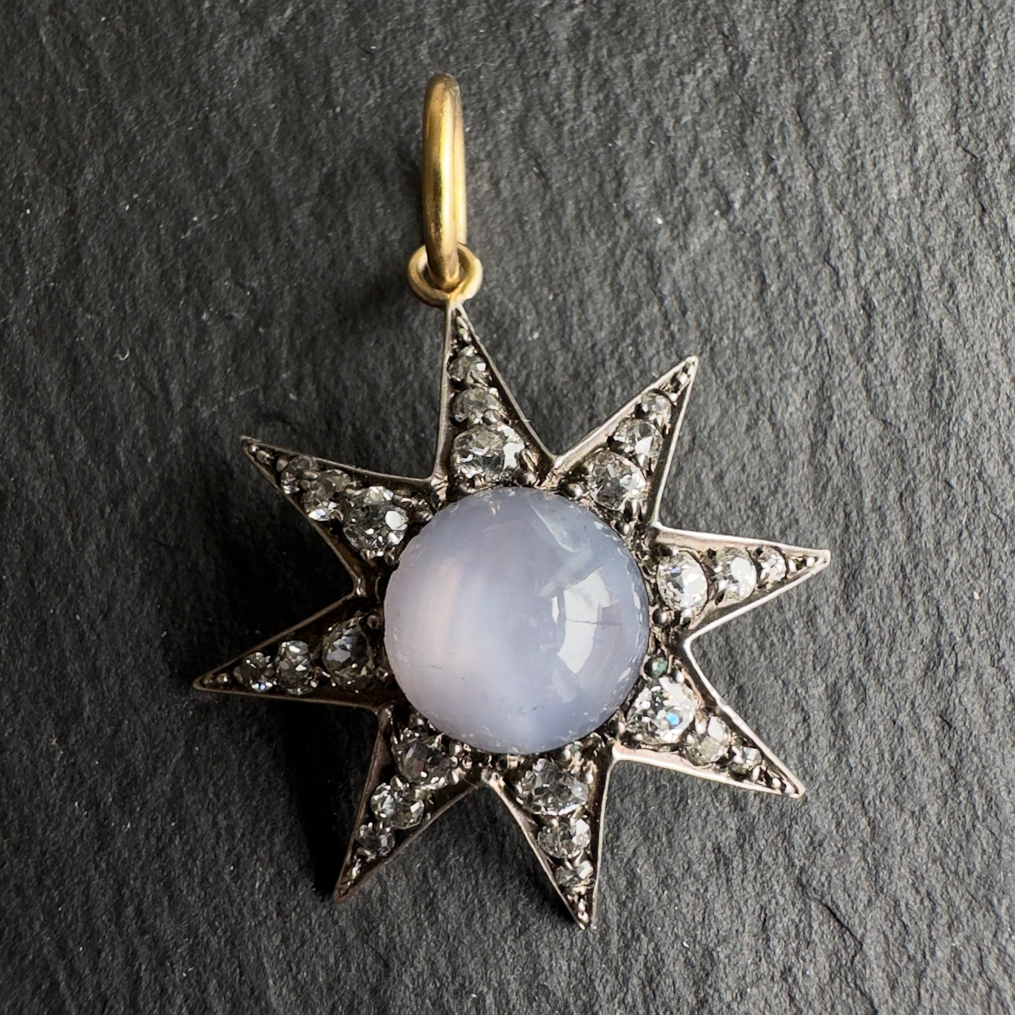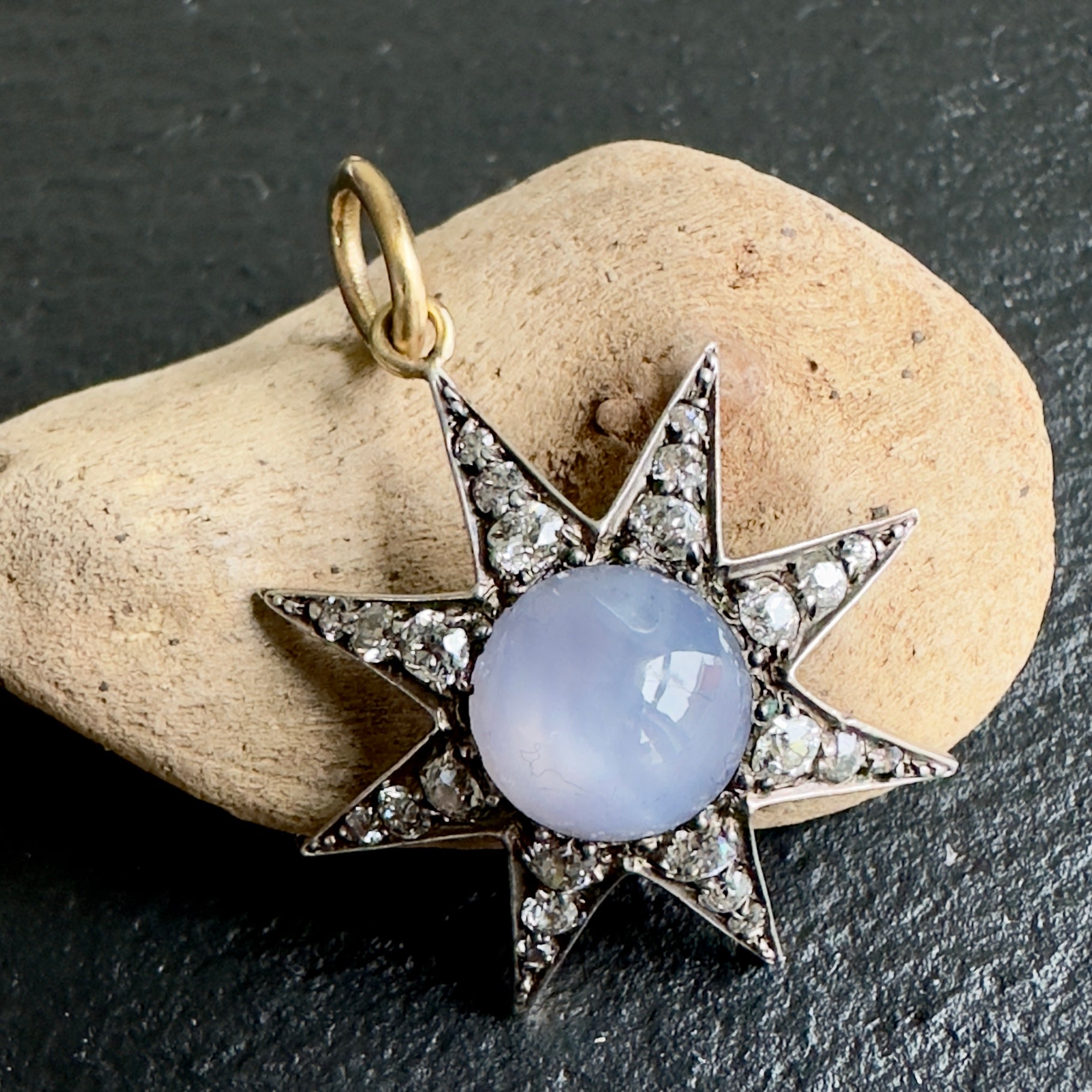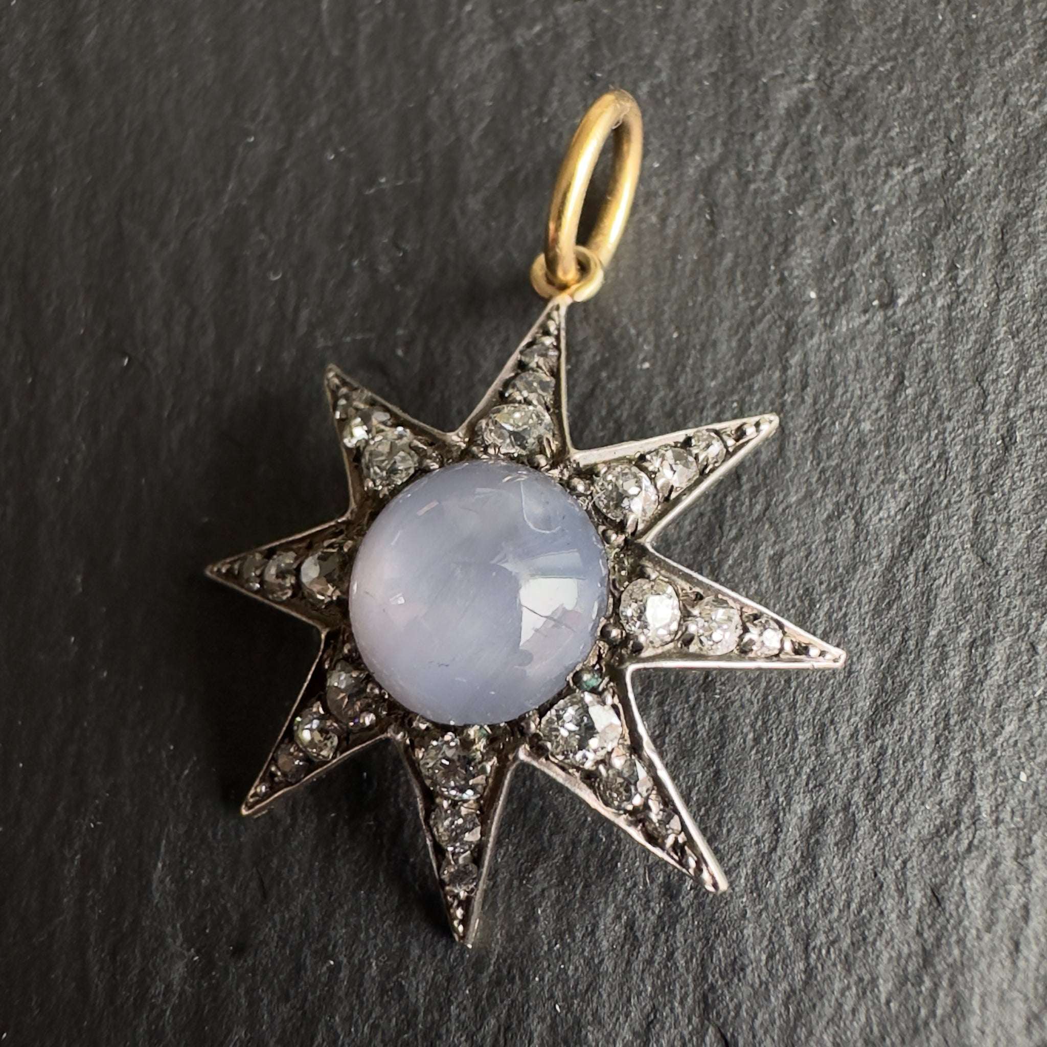 Star is 24.37mm wide with a domed effect center. The drop, including the bale, is 33.35mm in height. All stones are bead set. One slightly purplish gray round cabochon star sapphire measures app 9.05 x 5.6mm, est 5.25ct. The star under direct lighting has a very distinct and complete 6 ray star, better than what shows in the photo. A faint star is even visible in normal room lighting. 24 OMC diamonds approximately 0.95ct. Weight is 3.20 grams.