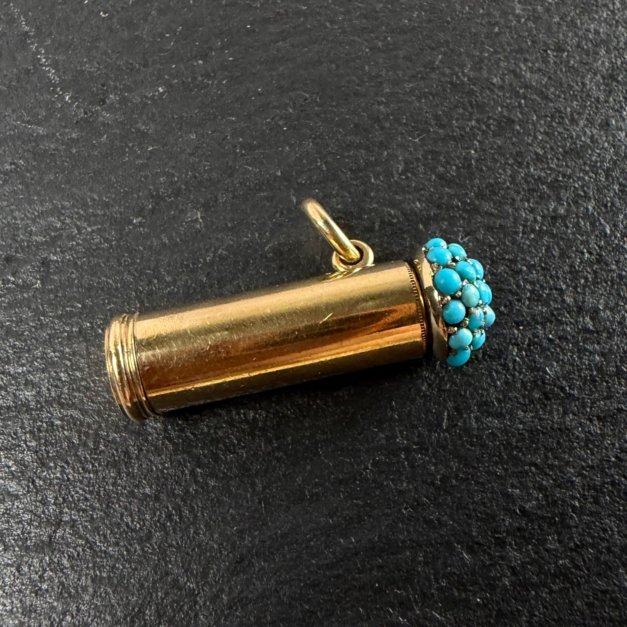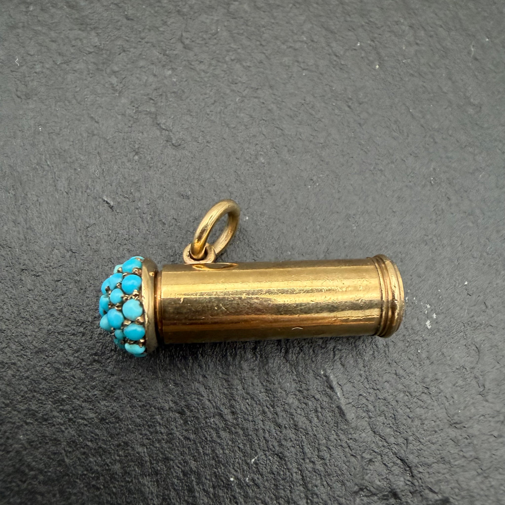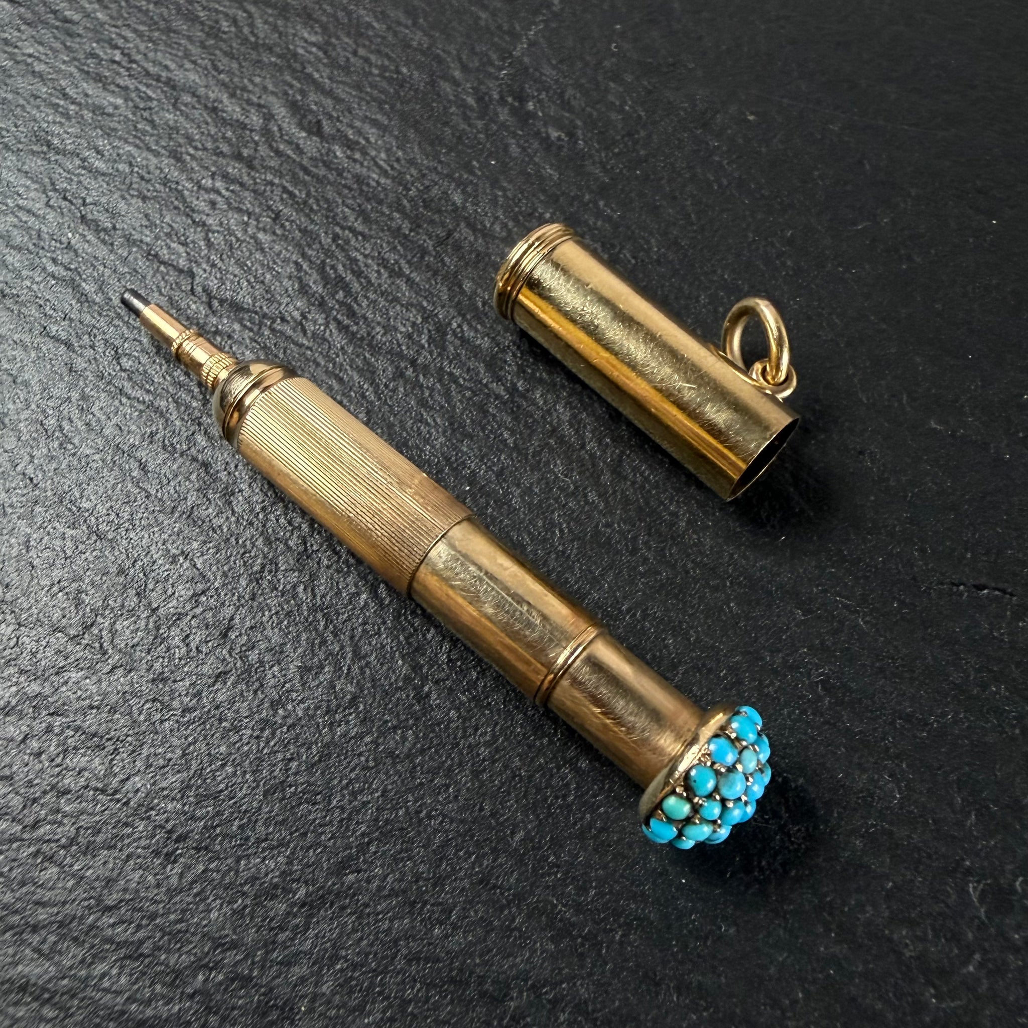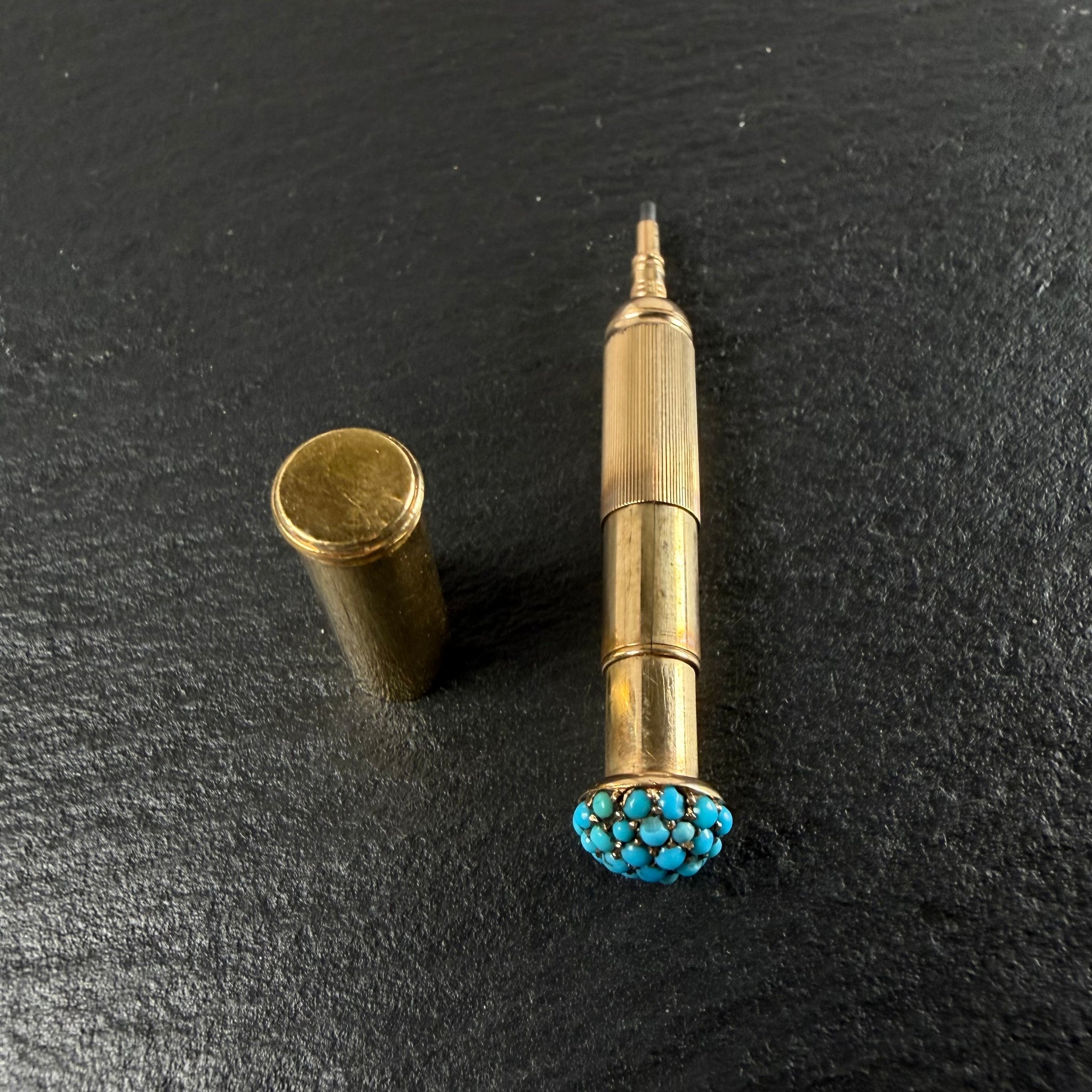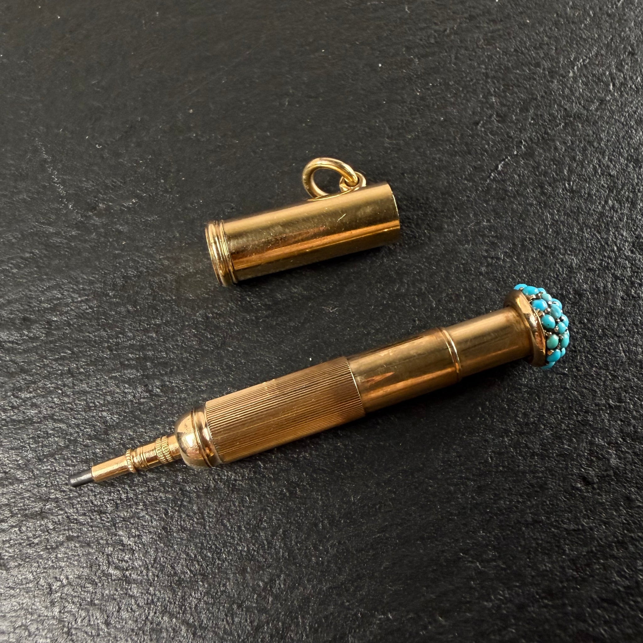 Victorian era, 9k gold and cabochon turquoise encrusted telescoping pencil pendant.