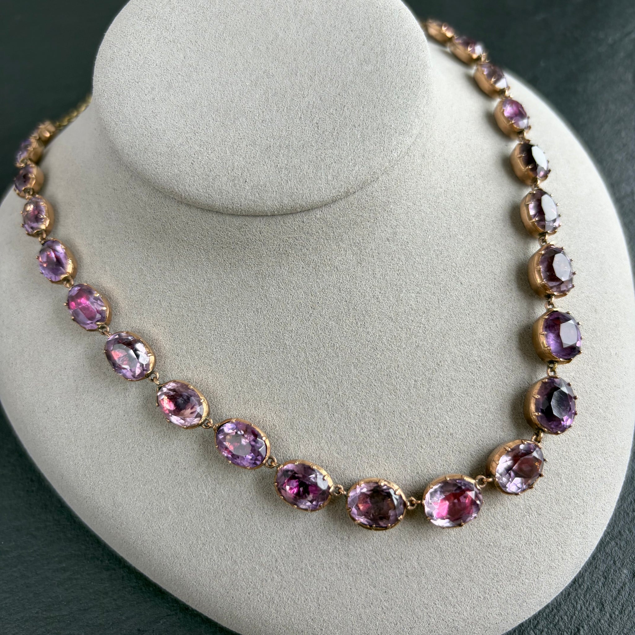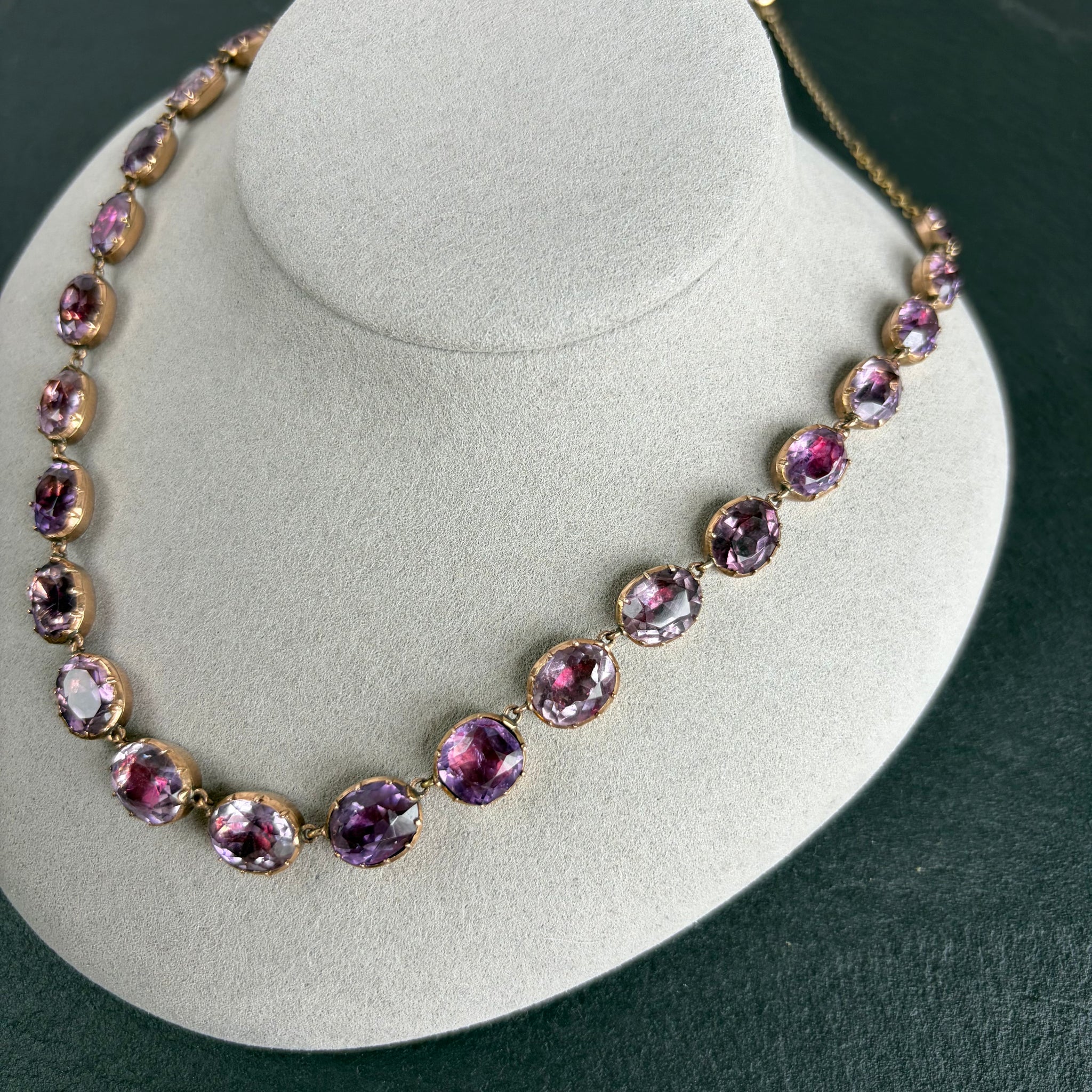 Late Georgian/Early Victorian era rivière necklace featuring faceted oval amethyst stones set in closed/foiled 9k gold collet settings. 14k gold chain pieces have been added in antiquity for added length.