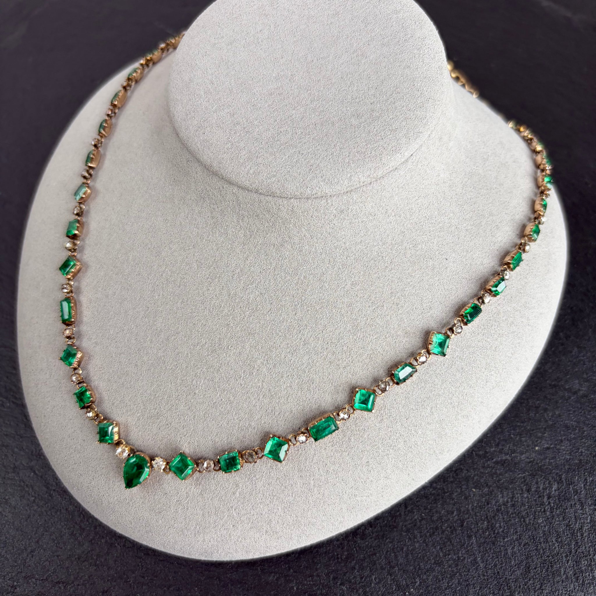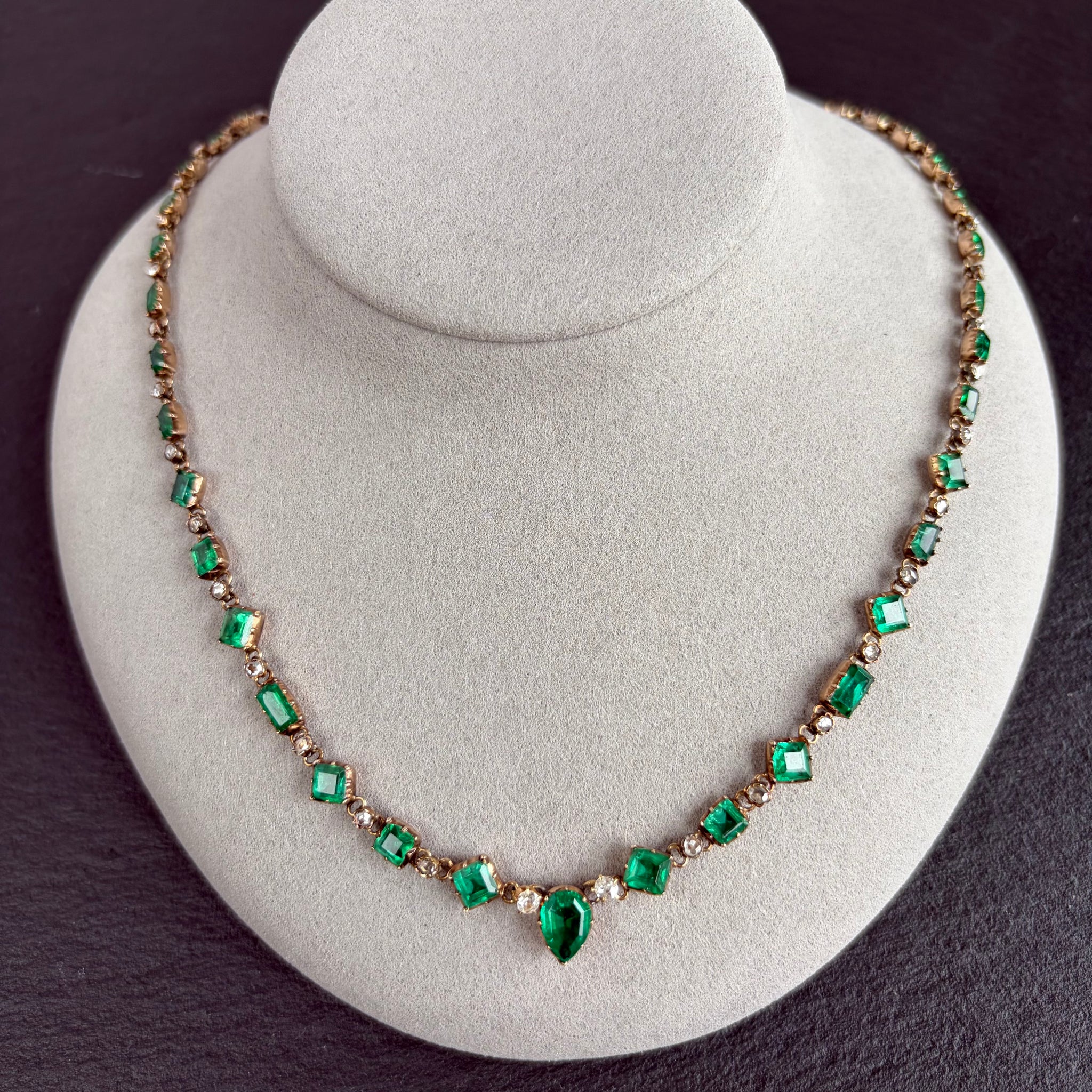 Antique, silver and 14k gold necklace featuring 34 emeralds totaling approximately 8.6ctw, and 33 diamonds totaling approximately 0.83ct.