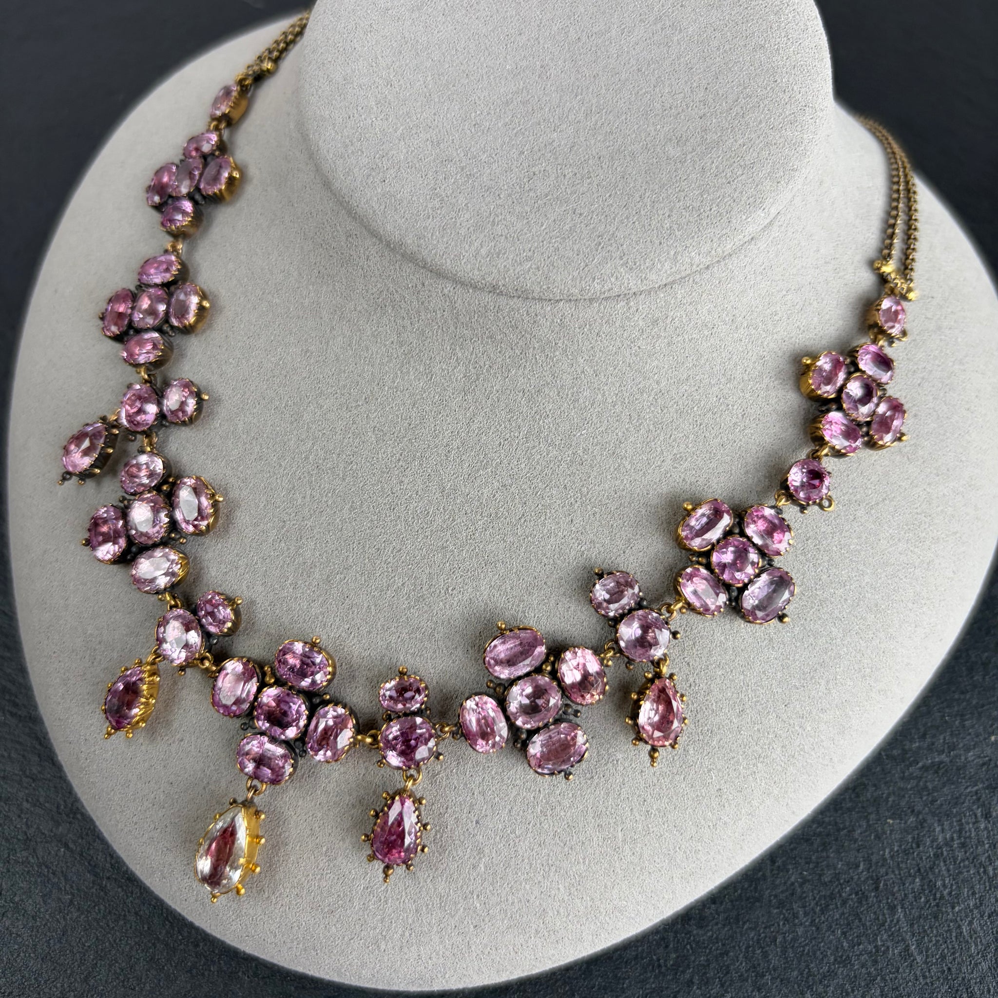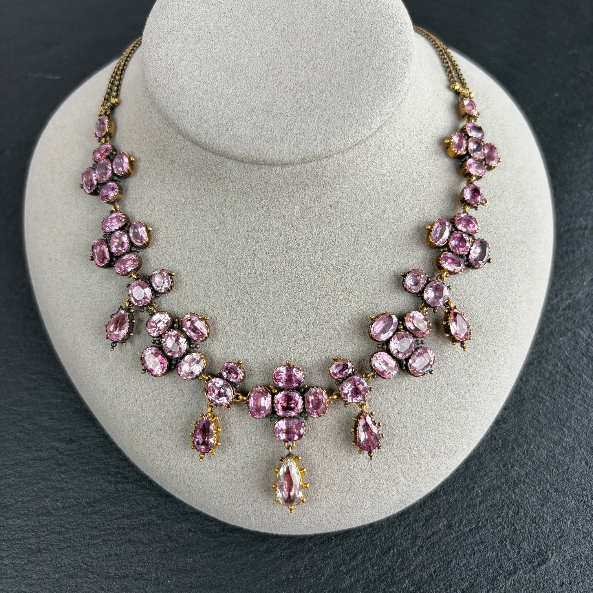 Georgian era, foiled/closed back precious topaz rivière with single, rock crystal quartz drop off of the center, all set in 18k gold with 15k gold rolo chain added for length.