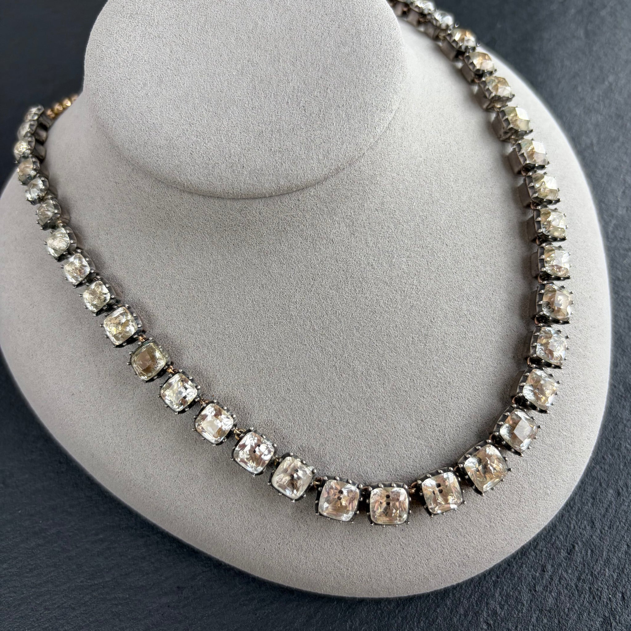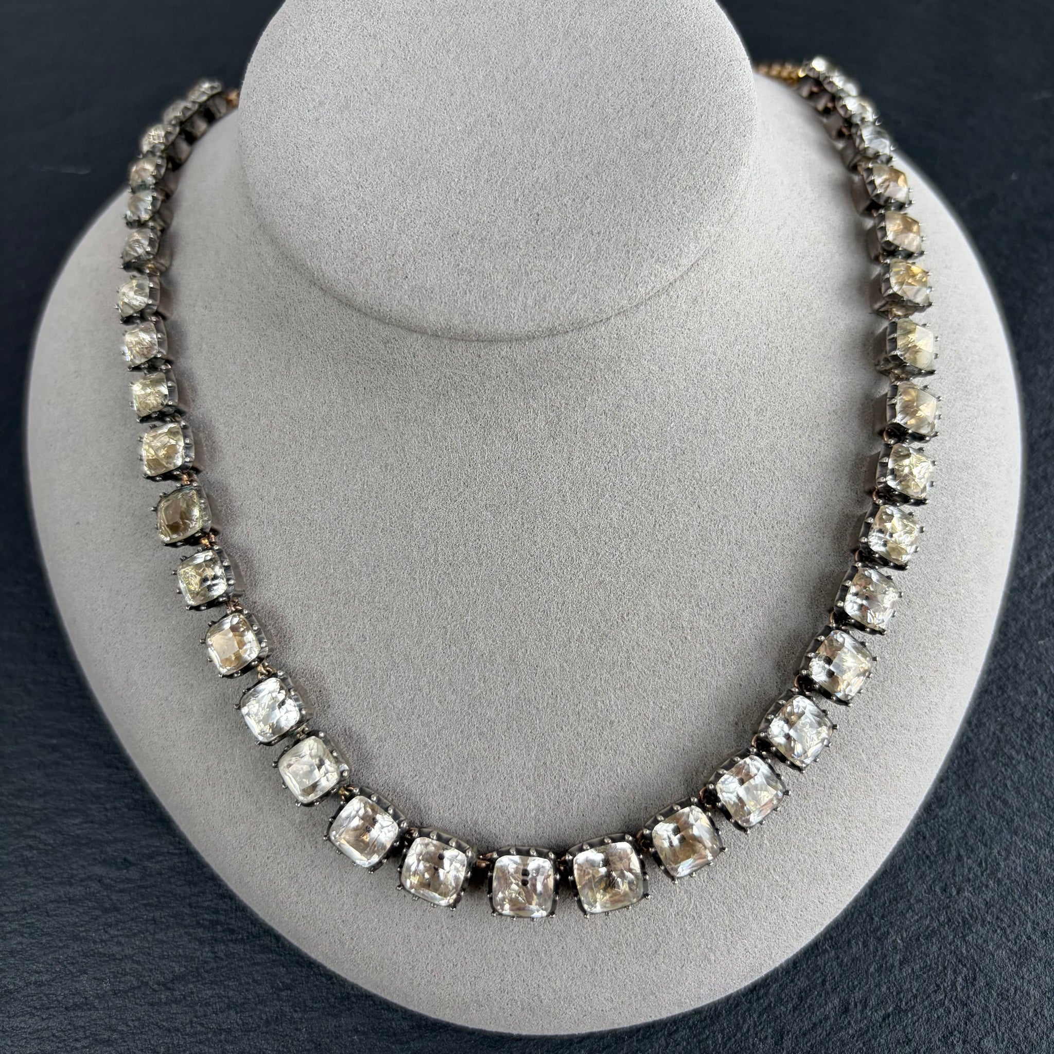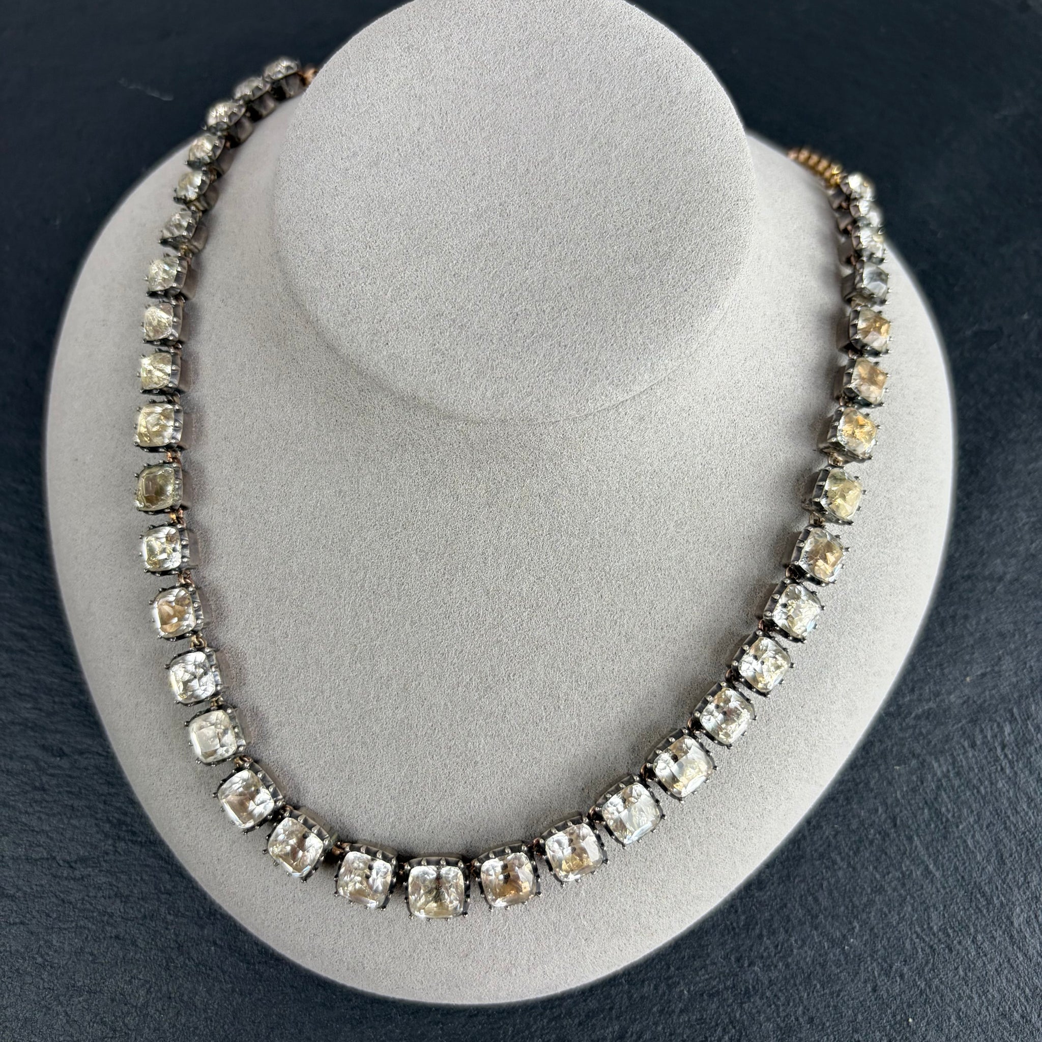 Late Georgian/Early Victorian era rivière necklace featuring faceted square rock crystal stones set in closed/foiled silver collet settings with a 9k gold wash backing. 9k gold chain pieces have been added in antiquity for added length.