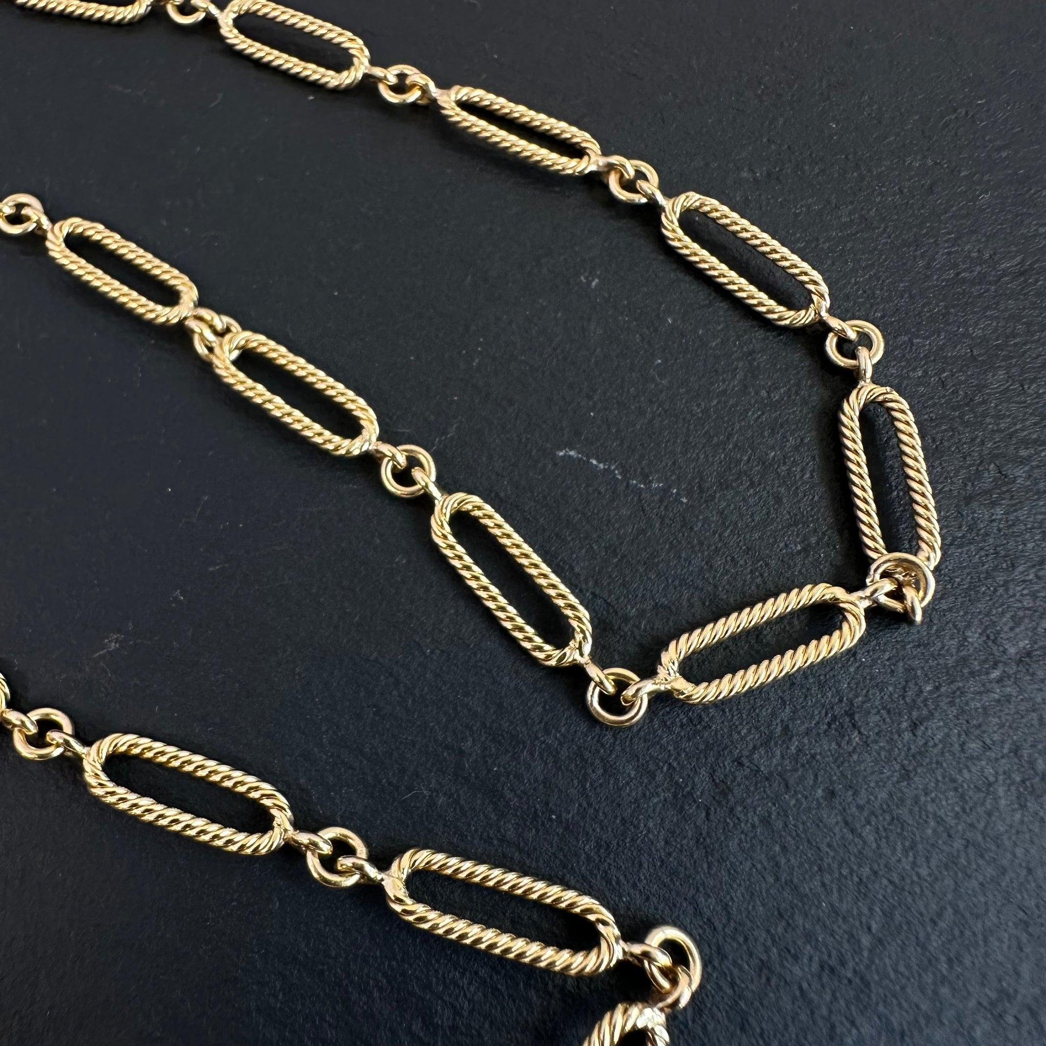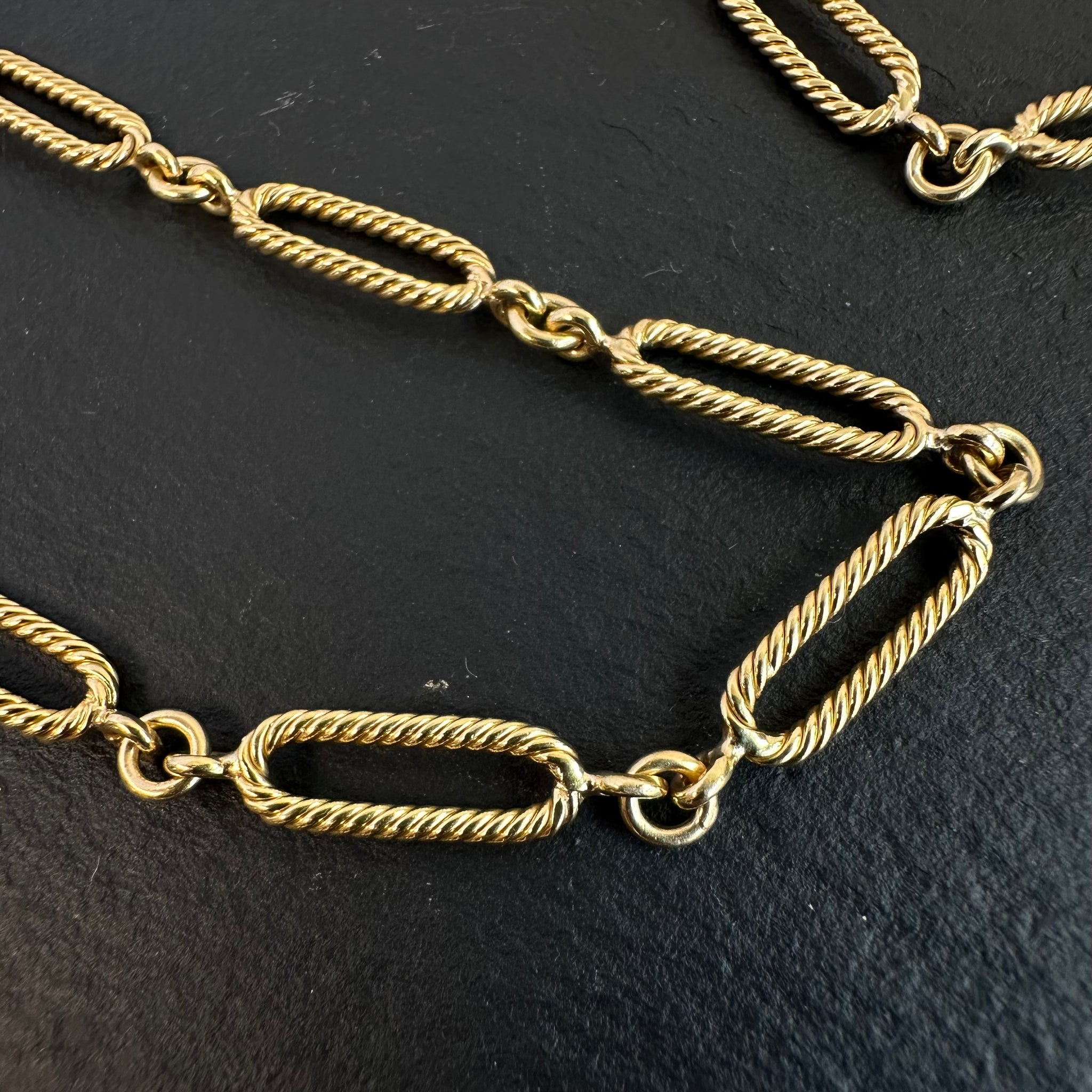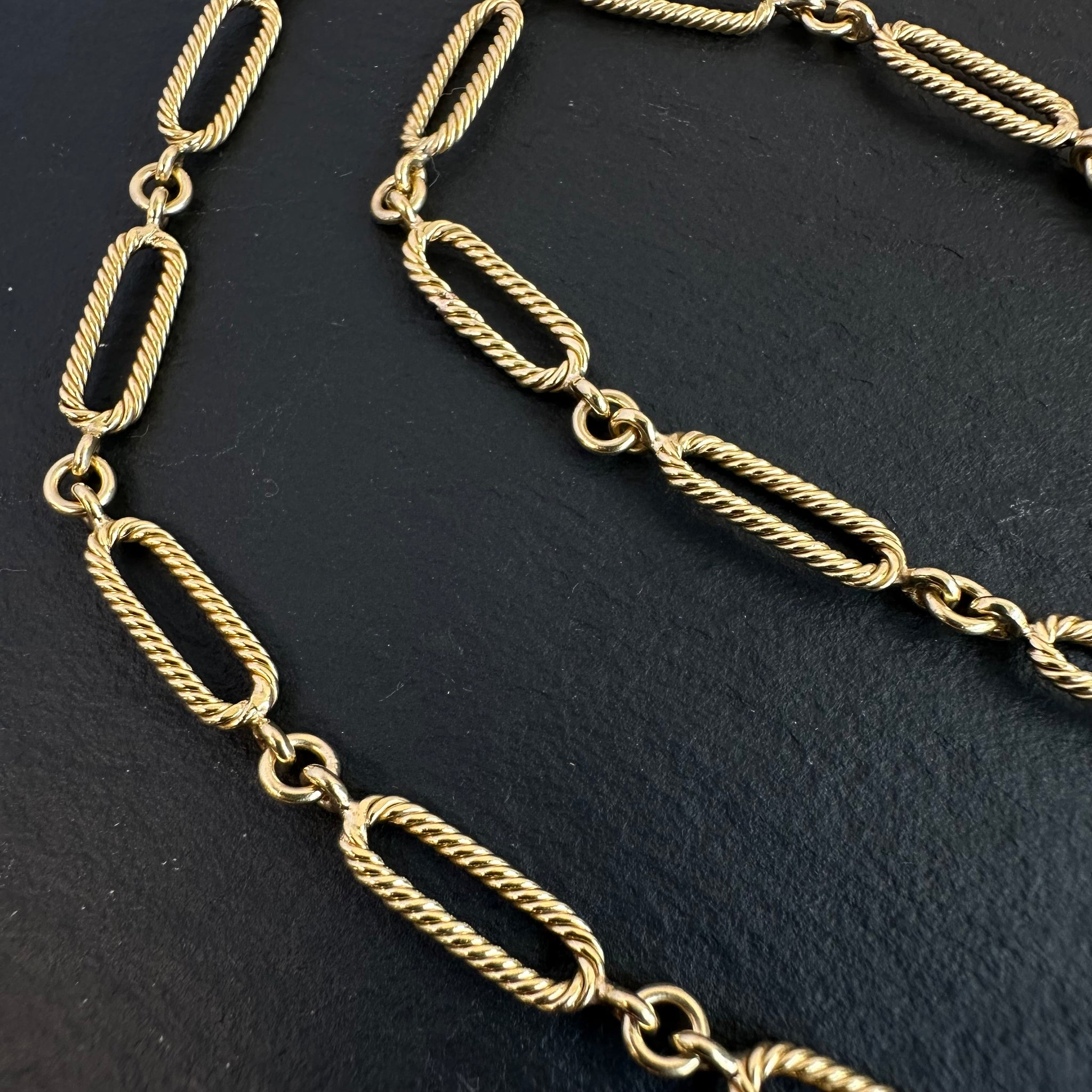 Vintage, 18k gold chain featuring long, oval textured links separated by smooth circular links.