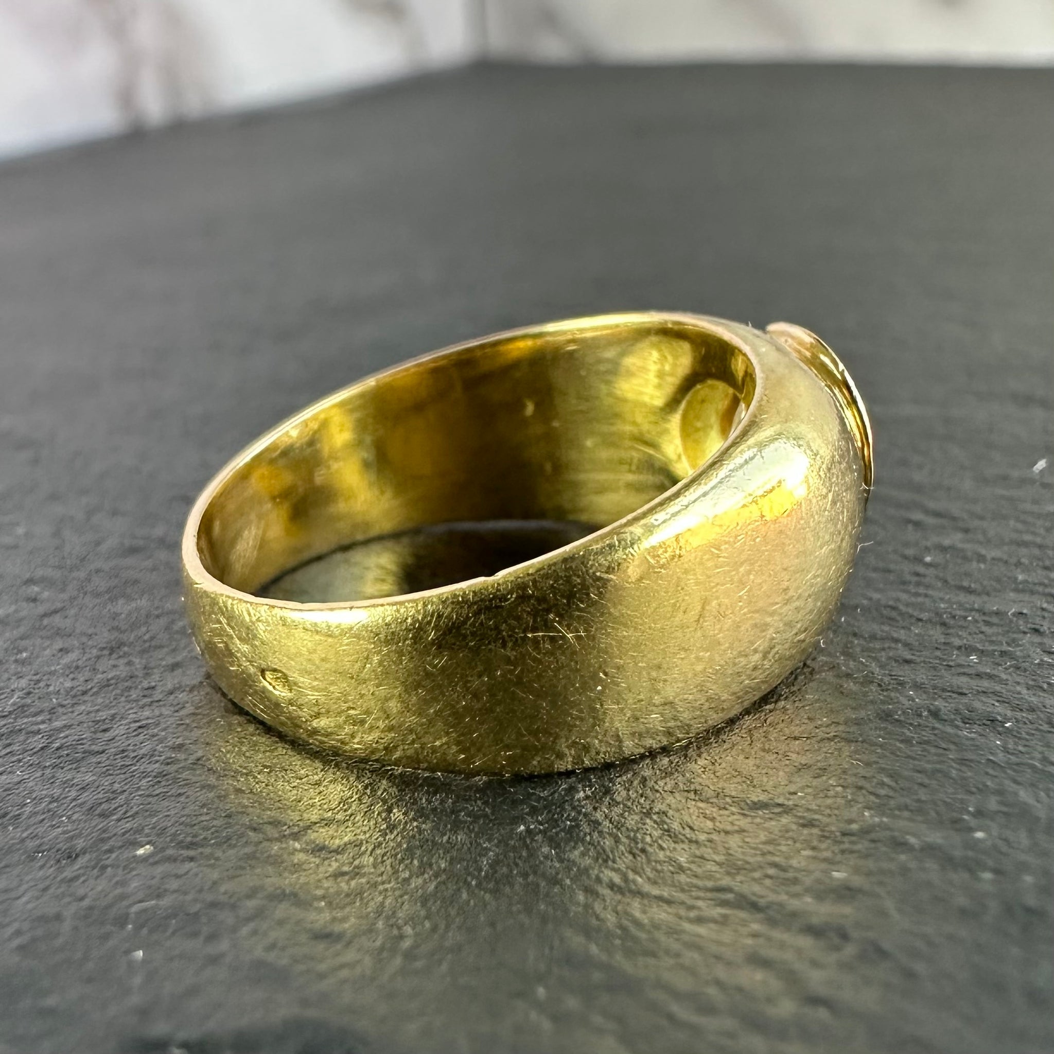 Size 8.5-8.75 and can be sized. Measures 9.8mm by 4.3mm thick. French hallmarks. Weight is 10.6 grams.