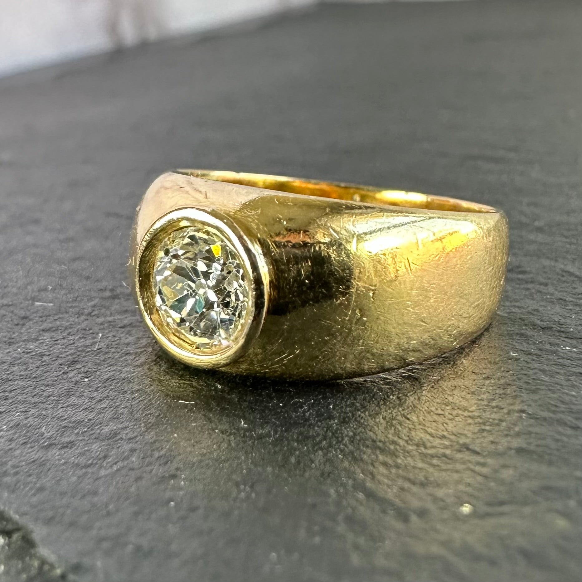 Vintage, French 18k gold and diamond gypsy set ring with circular bezel featuring a central 1.02ct OEC L/Si1 diamond.