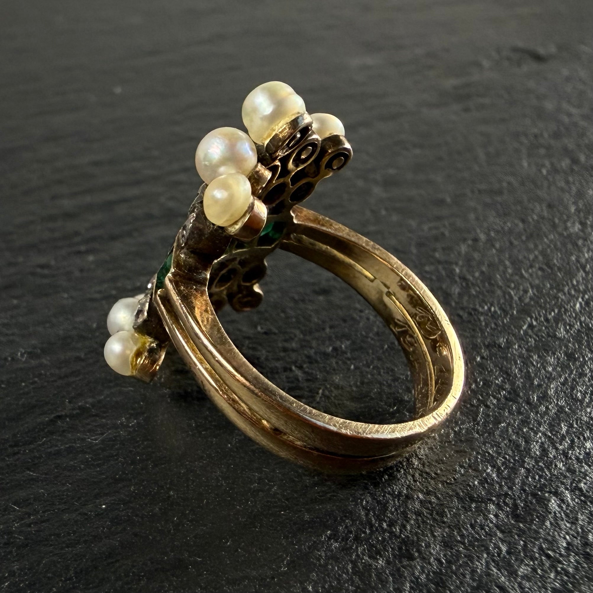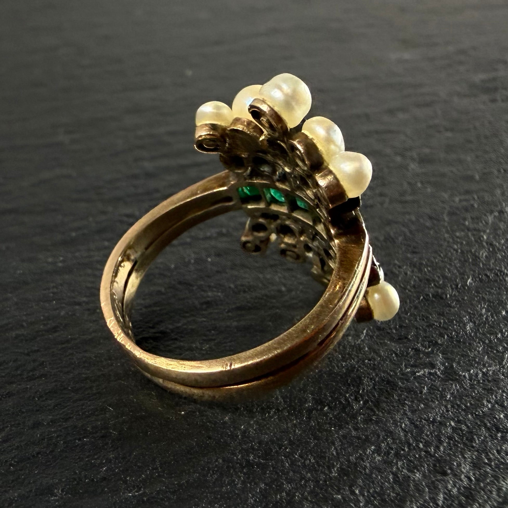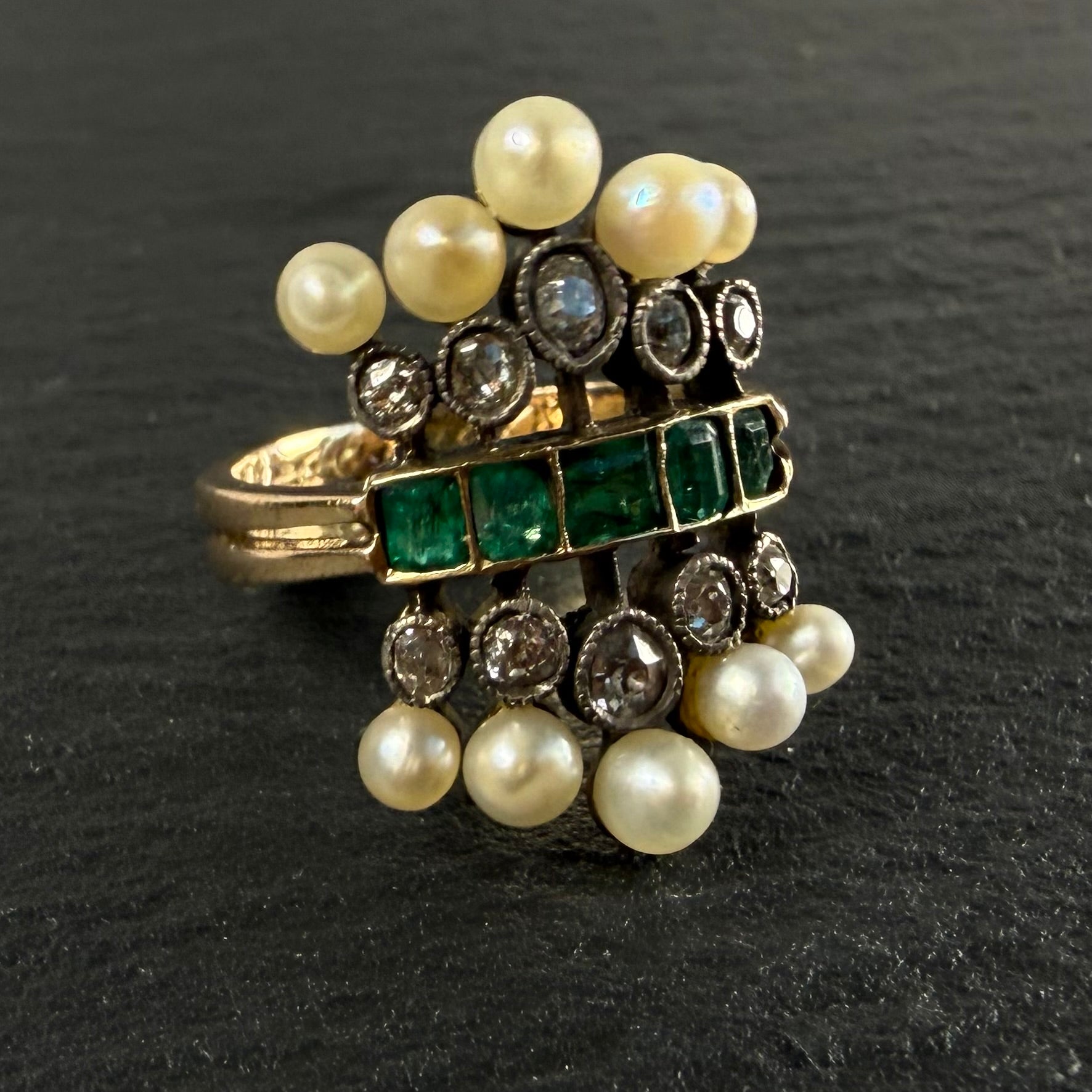 Victorian era, 18kt yellow gold twin shank antique ring with a central row of 5 emeralds totaling 0.55ct, surrounded by 10 old mine cut diamonds totaling 0.62ct and accented with 10 dome shaped pearls for an incredibly unique and visually stunning ring.